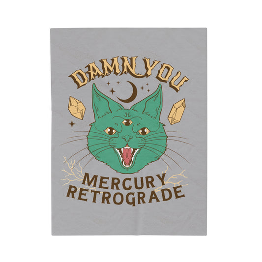 Damn You Mercury Retrograde Velveteen Plush Throw Blanket Trippy Three-Eyed Cat Design Spiritual Witchy Crystal Decor Astrology Zodiac Lover