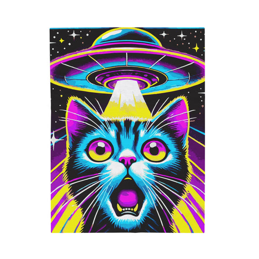 Colorful Cat Abduction Velveteen Plush Throw Blanket | Cool Cat Picked Up by Spaceship | Trippy Alien Decor Cat Lovers Cozy Fun Blanket Gift
