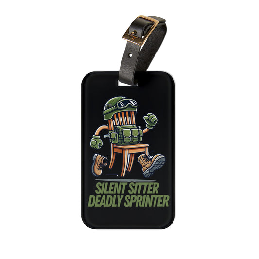 Silent Sitter Deadly Sprinter Luggage Tag | Tactical Chair Cartoon Baggage ID | Funny Prop Hunt Gamer Travel Accessory Military Chair Humor