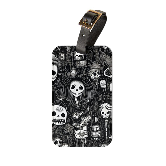 Eerie Black and White Skeleton Doodle Luggage Tag Gothic Art Travel Accessory Unique Baggage ID Death Skull Lovers Alternative Office Style