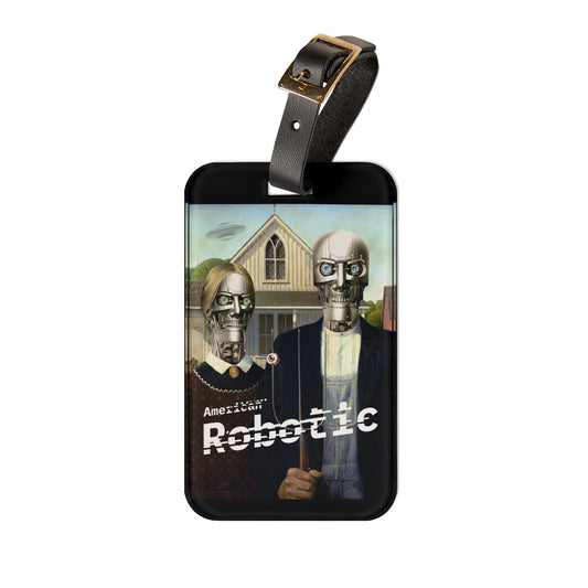 American Robotic Luggage Tag | American Gothic-Inspired Baggage ID | Tech-Advanced Robot Farmer Travel Accessory | Gift for Robot Lovers