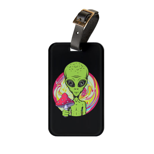 Alien Holding Mushroom Luggage Tag Trippy Psychedelic Baggage ID Rave Festival Travel Accessory Alien Mushroom Lovers Vibrant Festival Gift