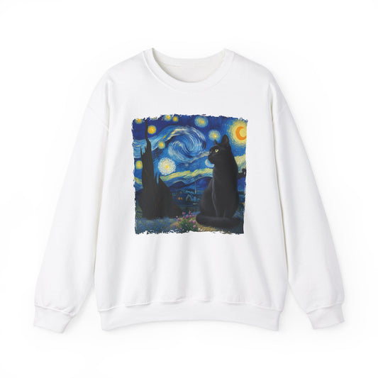 Black Cat Night Sky Crewneck Sweater | Starry Night-Inspired Feline Art | Cat Lovers Sweatshirt | Humorous Cat Parody Apparel Cat Gift