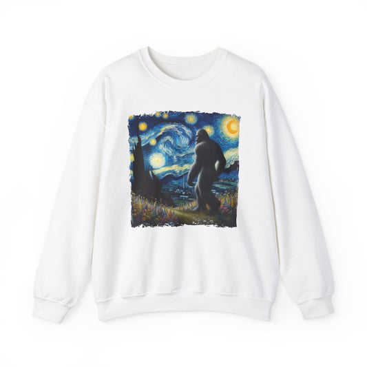 Bigfoot Night Sky Crewneck Sweater | Starry Night Inspired Art | Humorous Sasquatch Sweatshirt | Fun Gift for Quirky Bigfoot Lovers