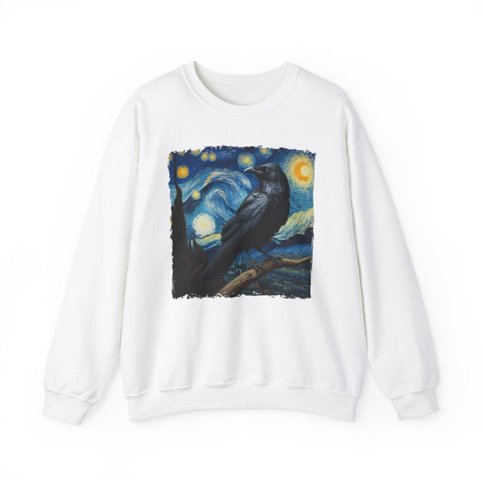 Black Raven Night Sky Crewneck Sweater | Starry Night-Inspired Art Pullover | Mystical Gothic Bird Lover Sweatshirt Witchcraft Enthusiasts