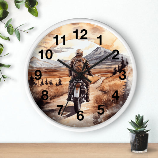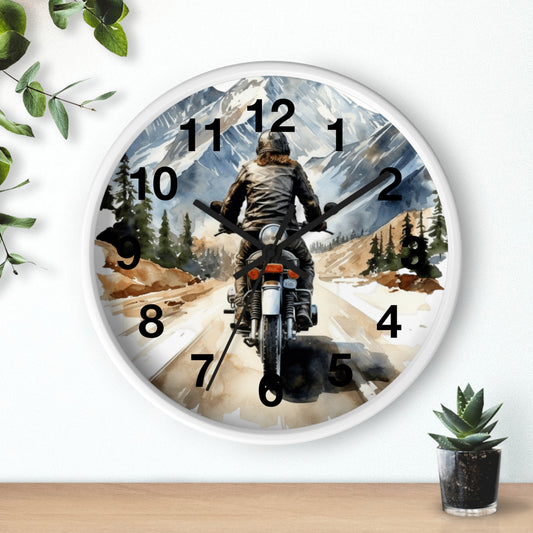 Biker Riding Open Road Wall Clock | Mountain Range Scenic View Motorcycle Art Unique Biker Decor Adventure Gift for Bikers Battery Operated