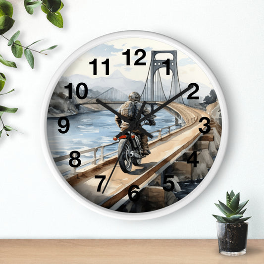 Scenic Bridge Vintage Motorcycle Wall Art Beautiful Water View Biker Decor Unique Biker Gift Retro Motorcycle Wall Clock Battery Operated