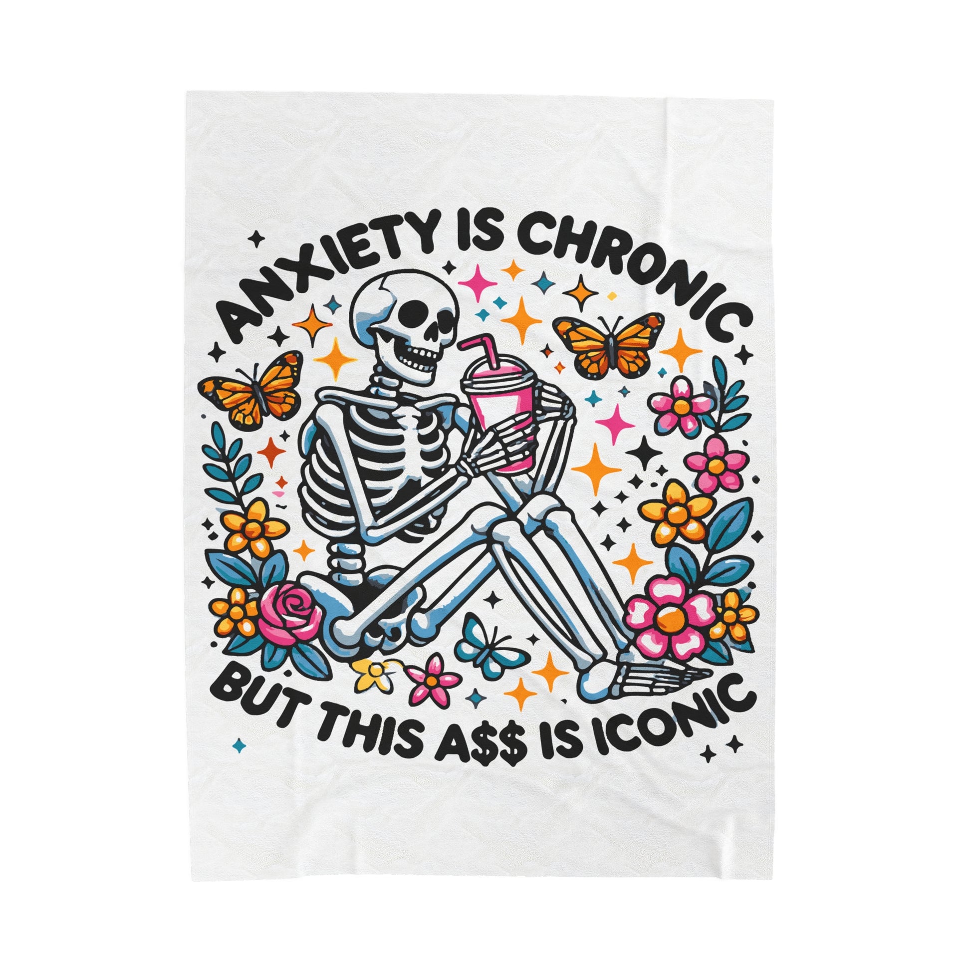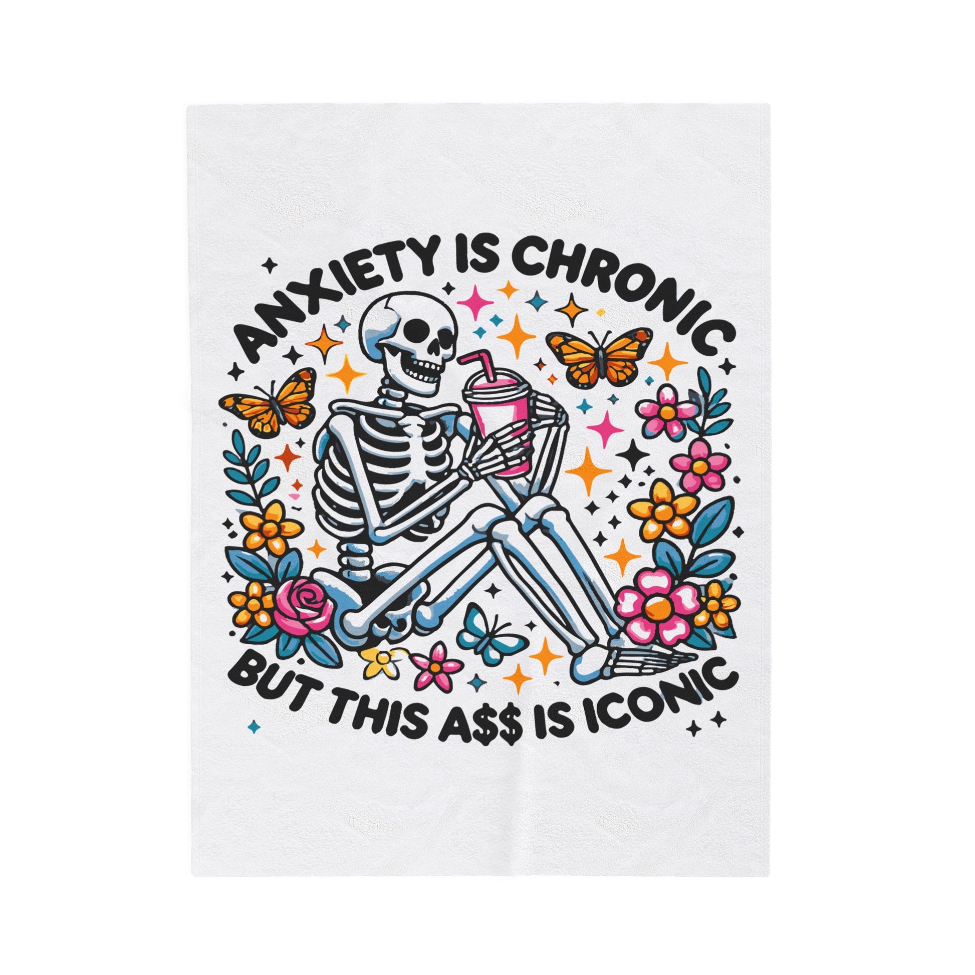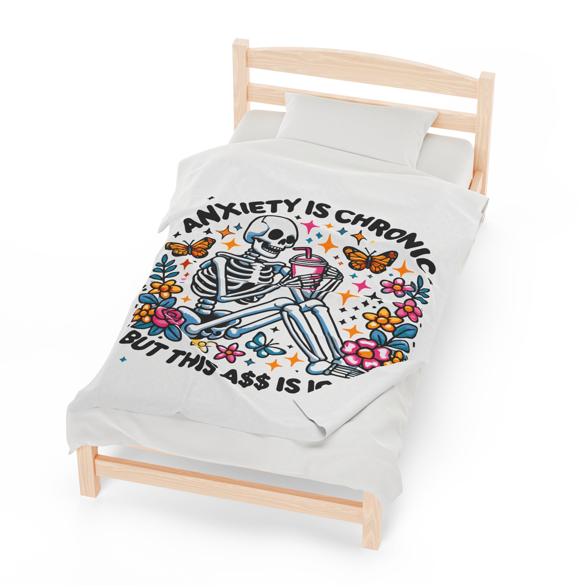 Anxiety Is Chronic Velveteen Plush Throw Blanket Snarky Skeleton Vibes Sarcastic Quotes Spooky Girly Cozy Blanket Gift Anxiety Humor Lovers