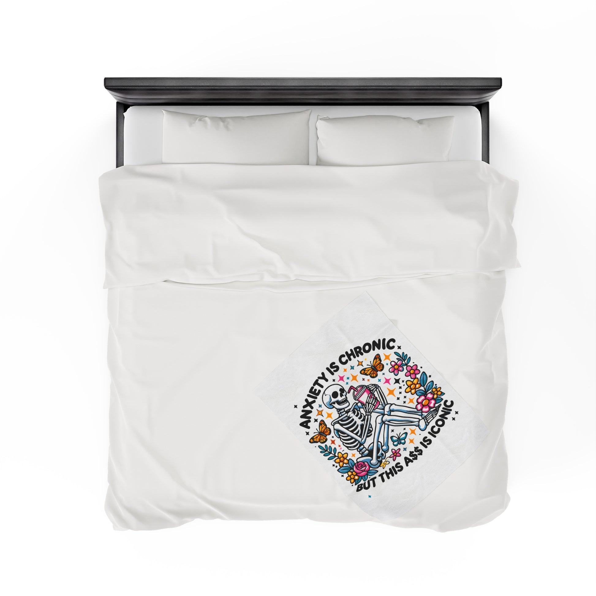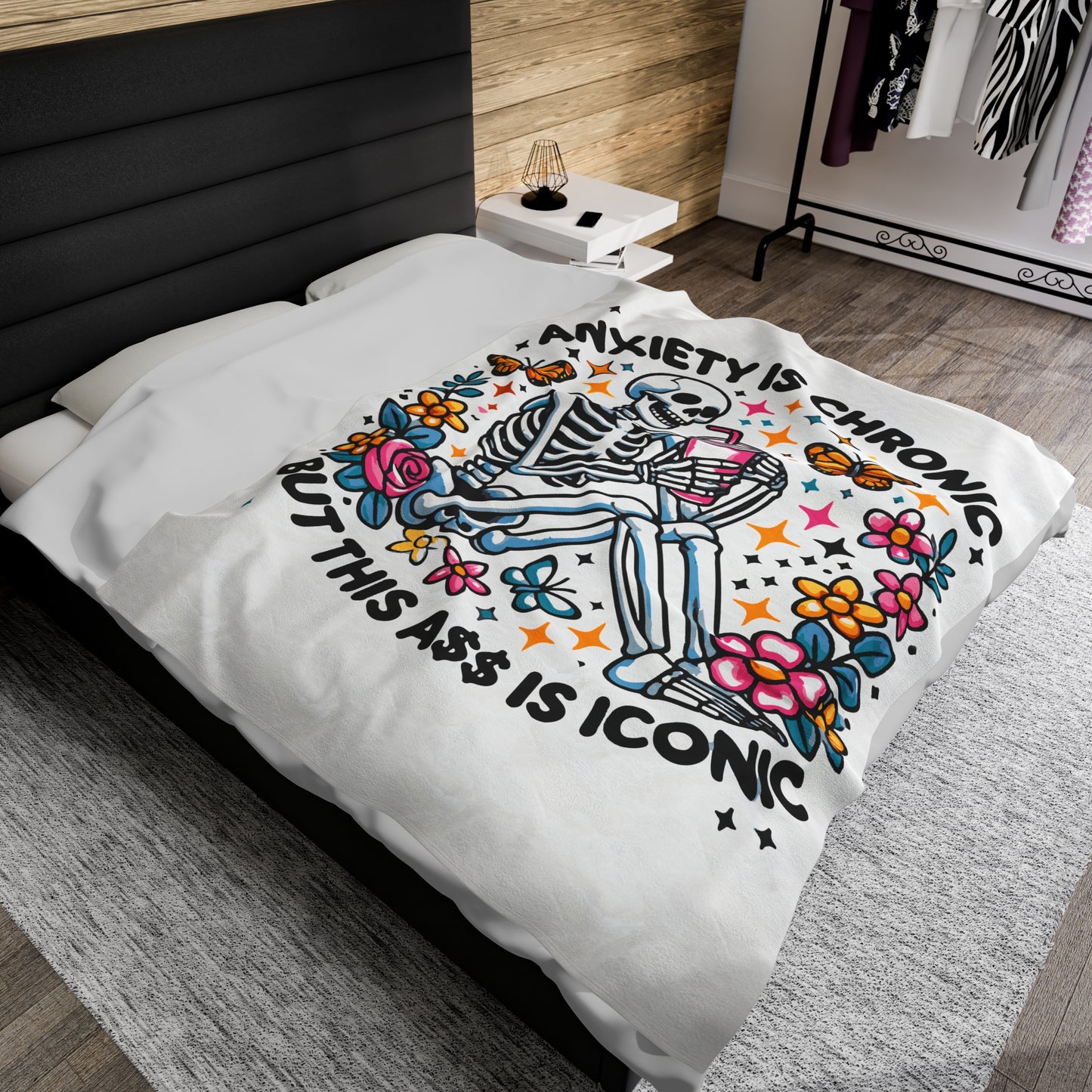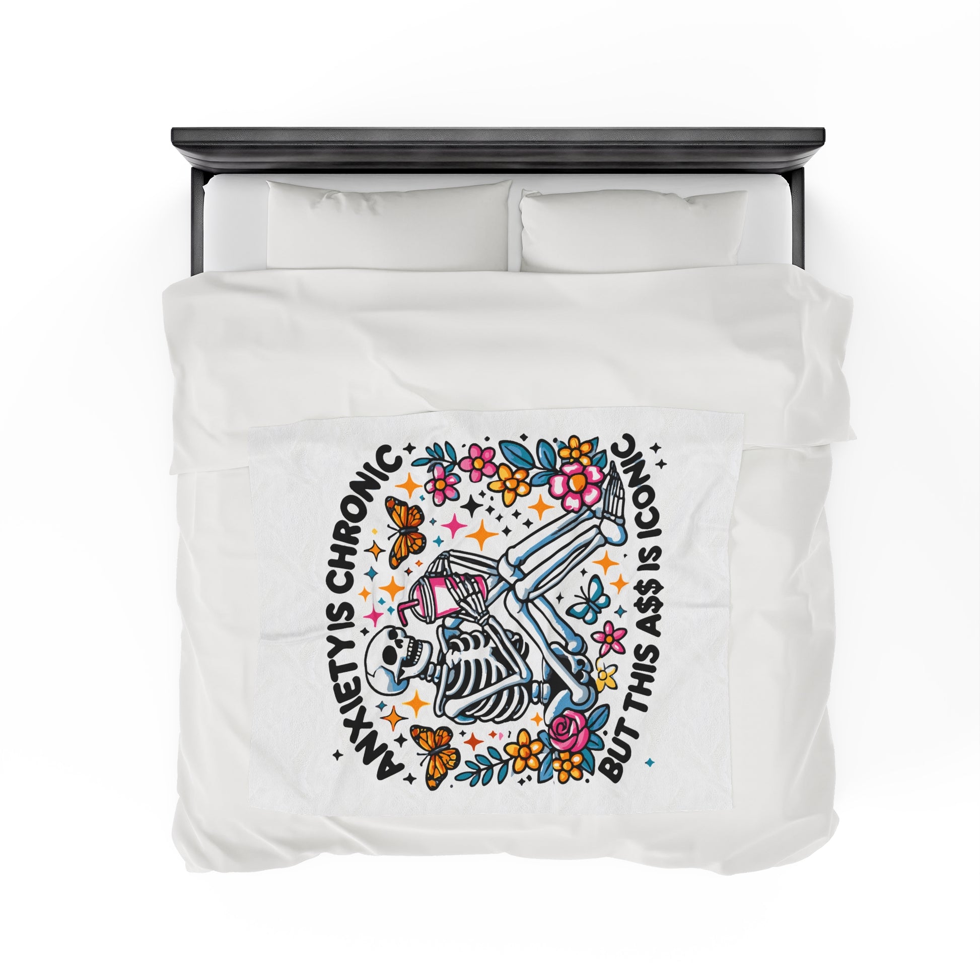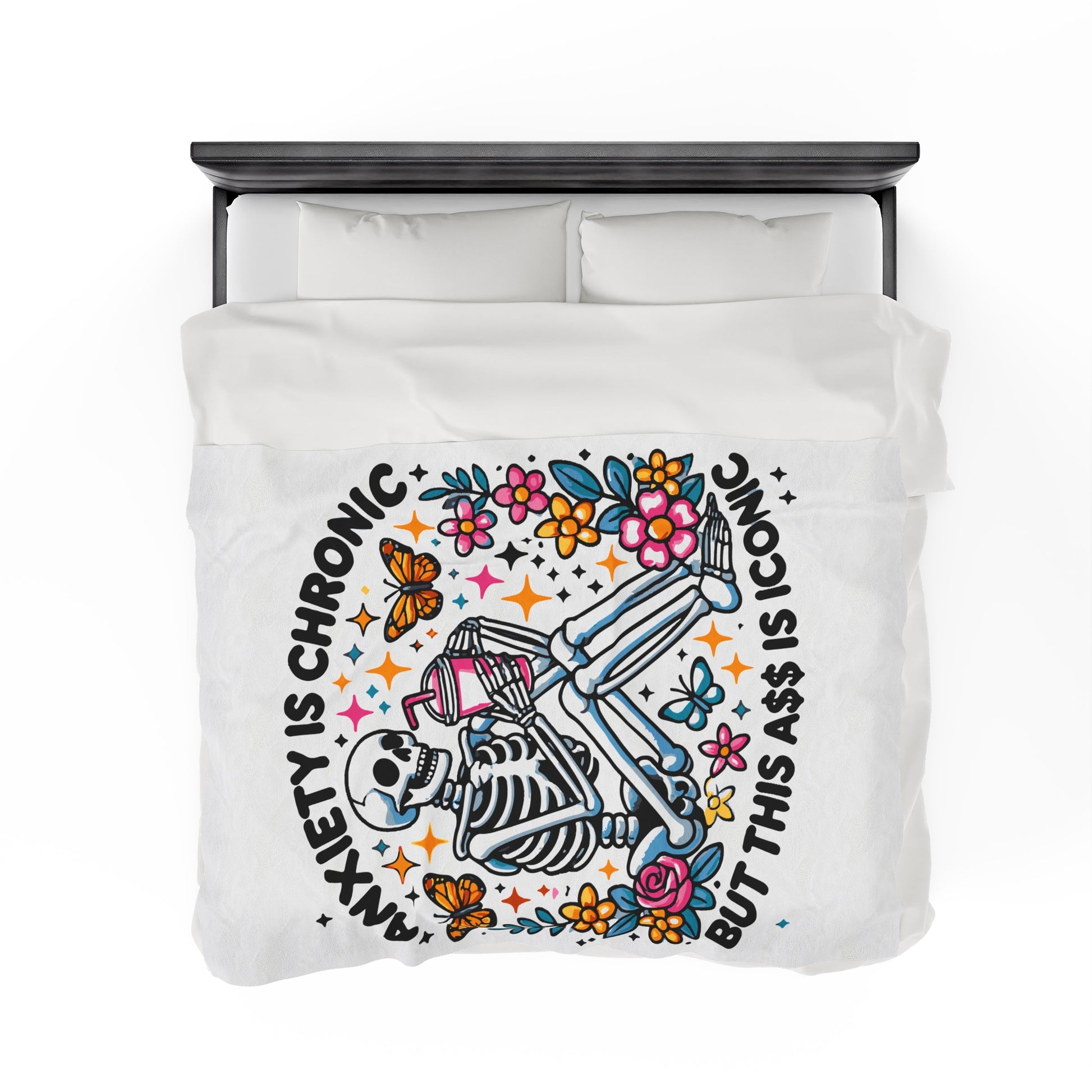 Anxiety Is Chronic Velveteen Plush Throw Blanket Snarky Skeleton Vibes Sarcastic Quotes Spooky Girly Cozy Blanket Gift Anxiety Humor Lovers