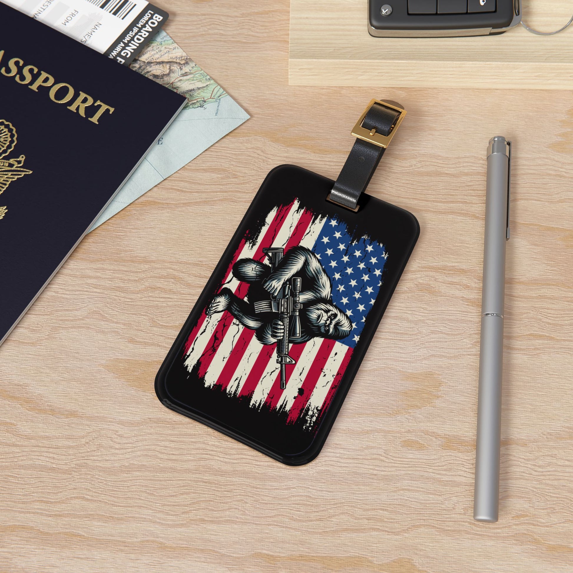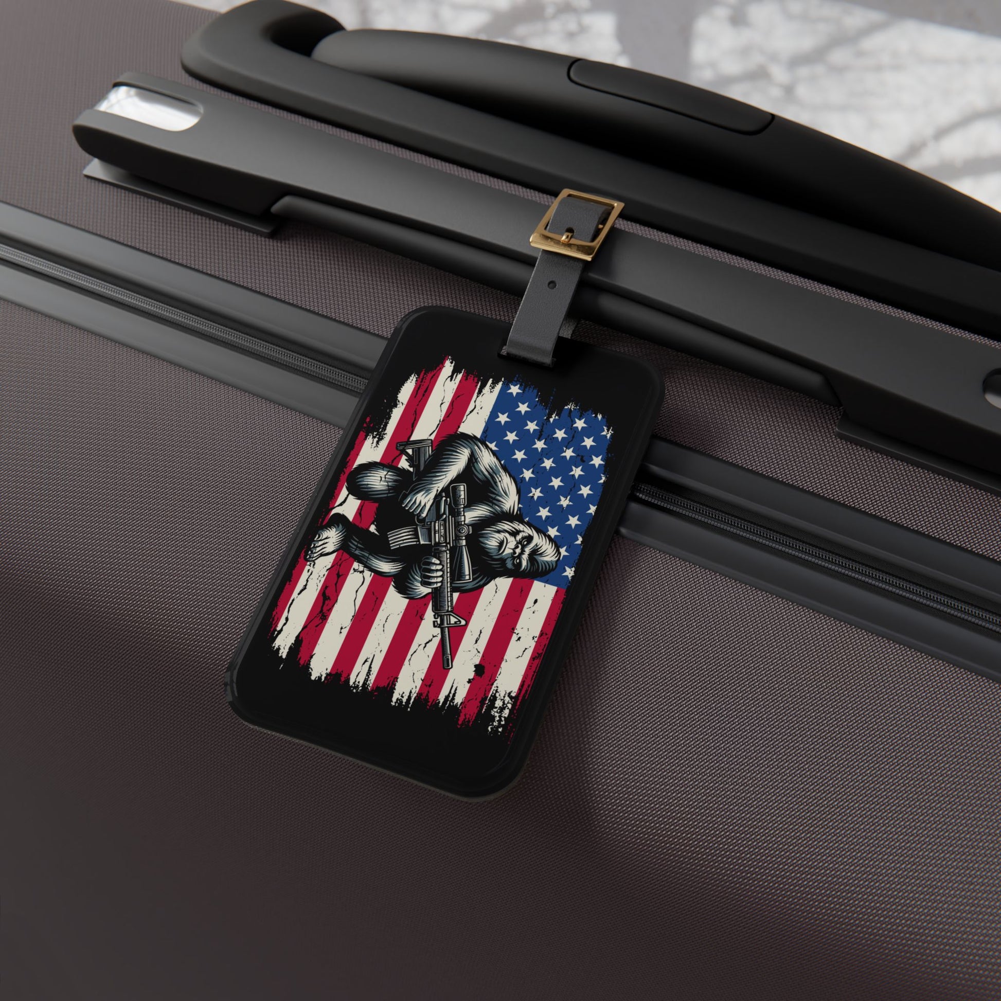 Bigfoot with Gun American Flag Luggage Tag | Patriotic Sasquatch Baggage ID | USA Pride Travel Accessory Legendary Freedom Gift for Patriots
