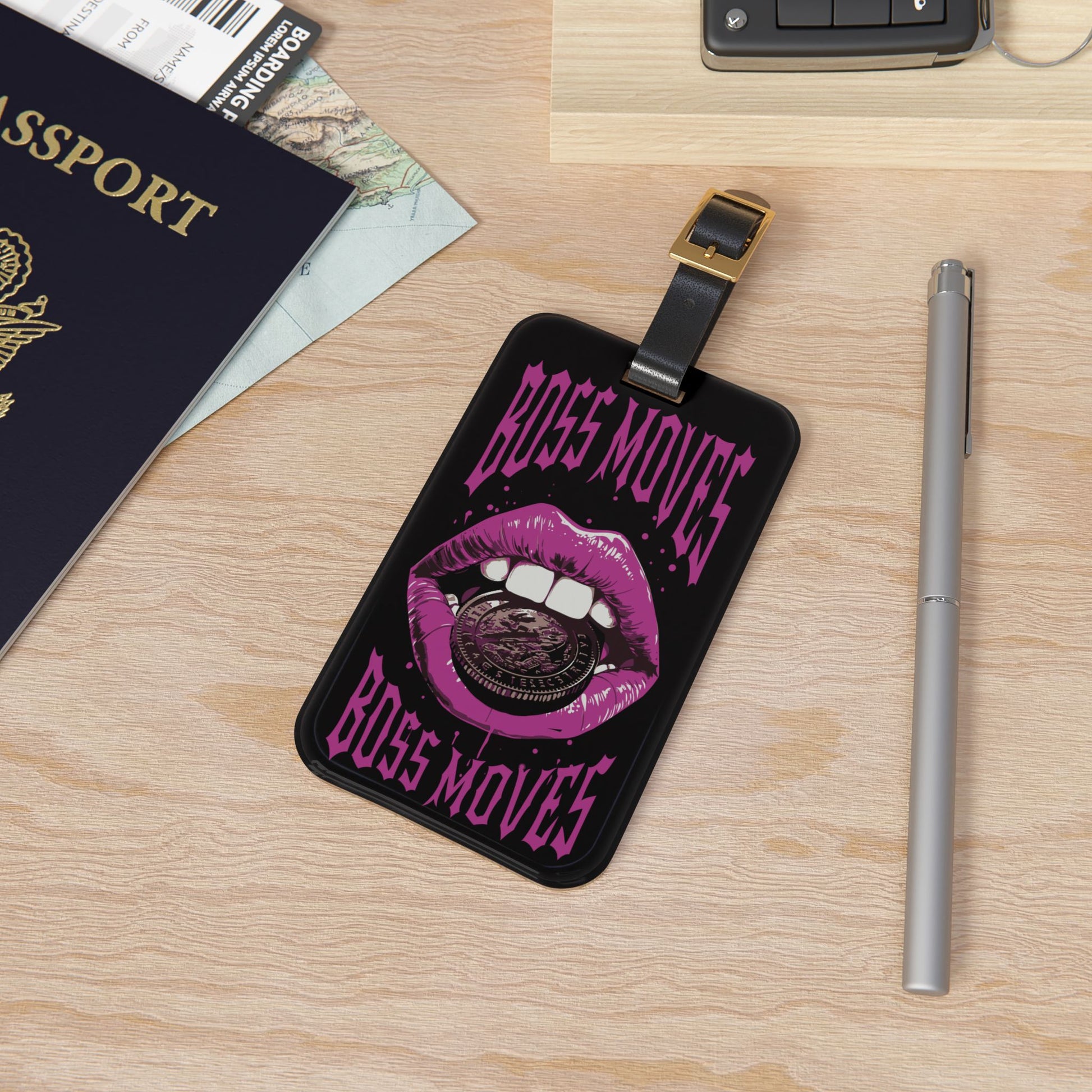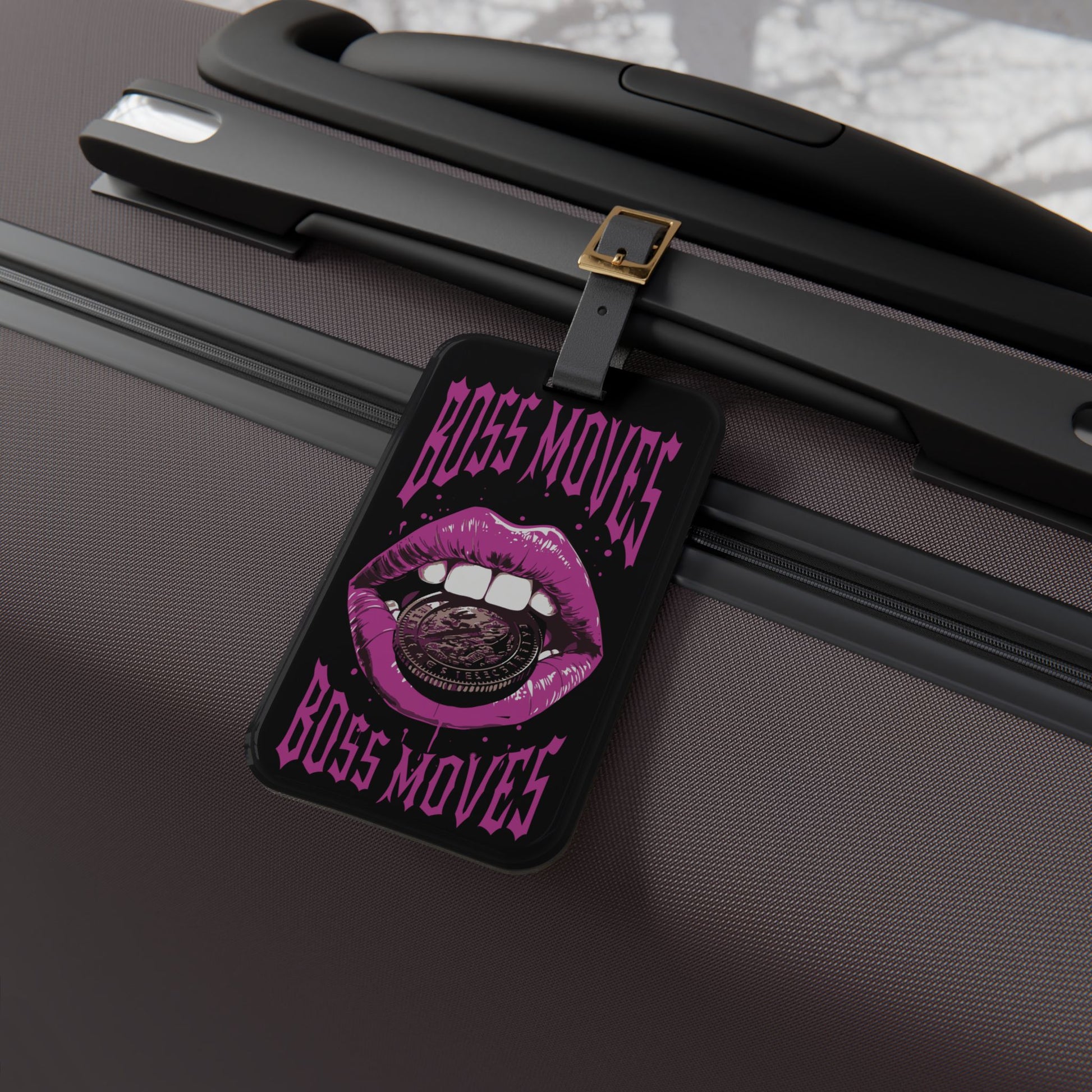 Boss Moves Luggage Tag | Purple Lips Holding Coin Design | Hustler Baggage ID for Bosses | Street Culture Travel Accessory Money Travel Tag