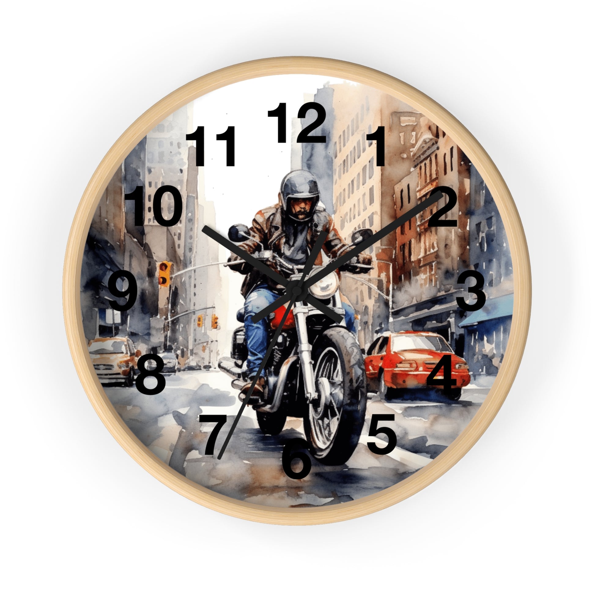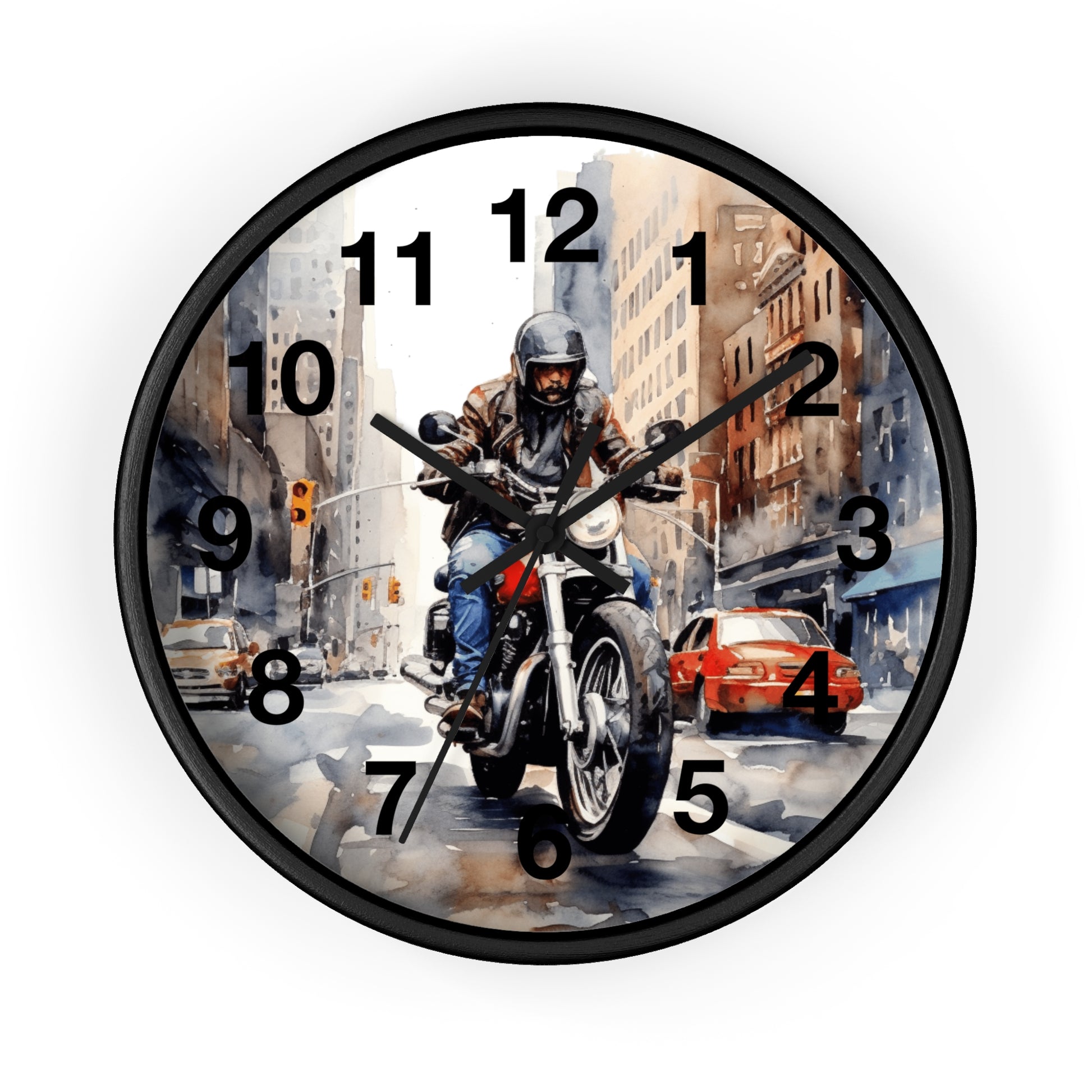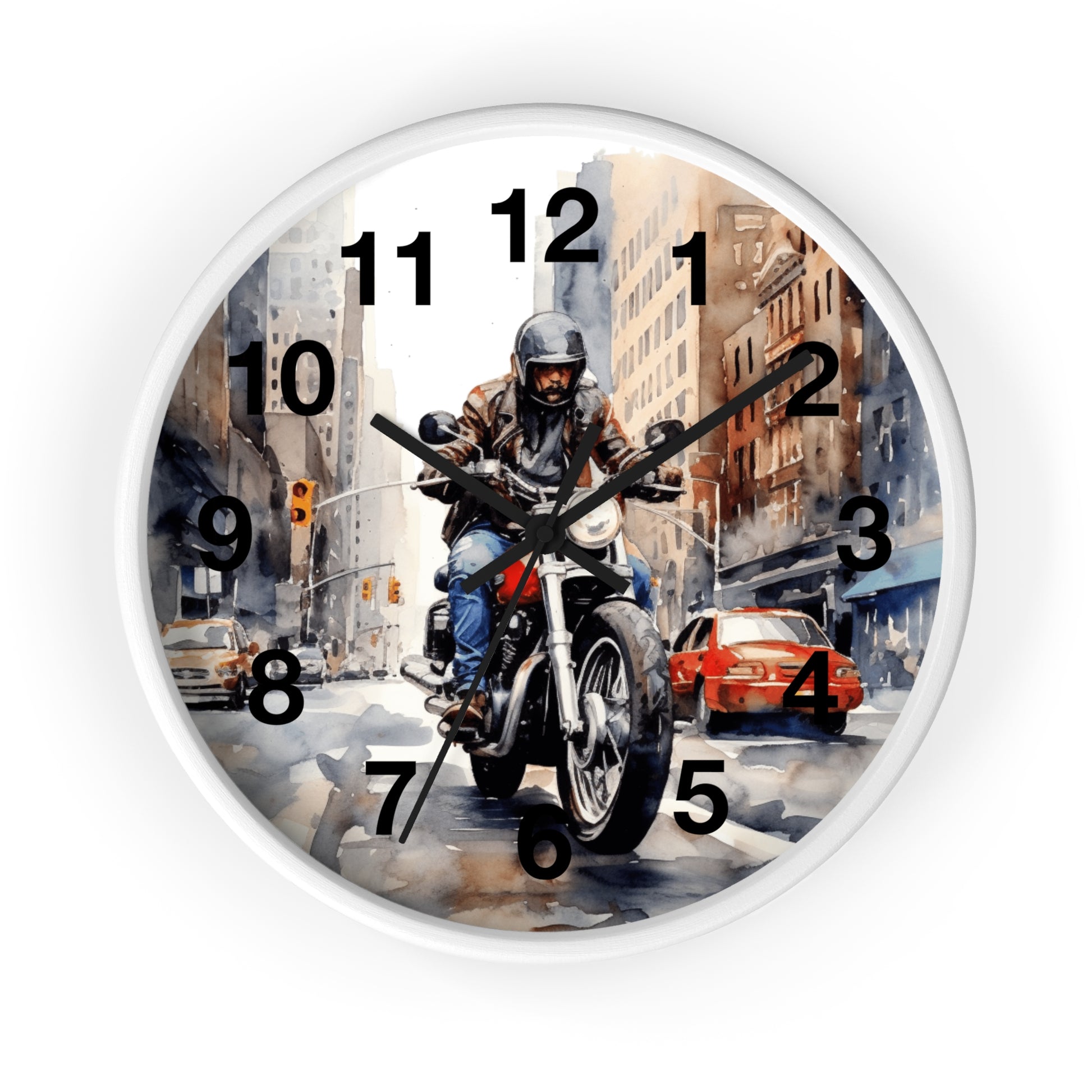 City Street Motorcycle Wall Clock | Urban Biker Decor | Rider Through City Art | Unique Gift for Bikers Cool Man Cave Clock Battery Operated