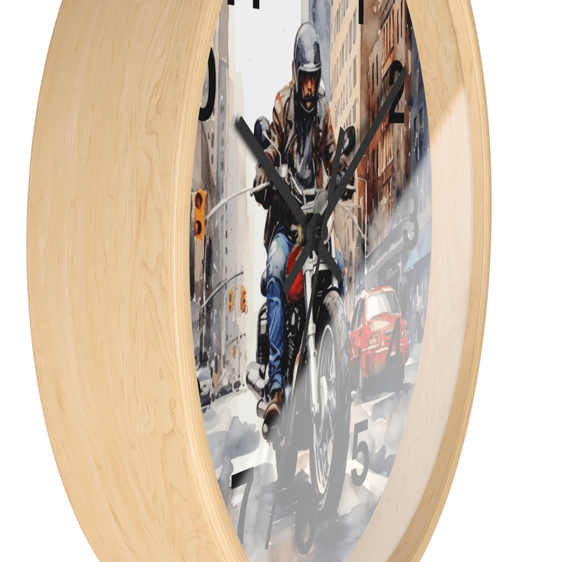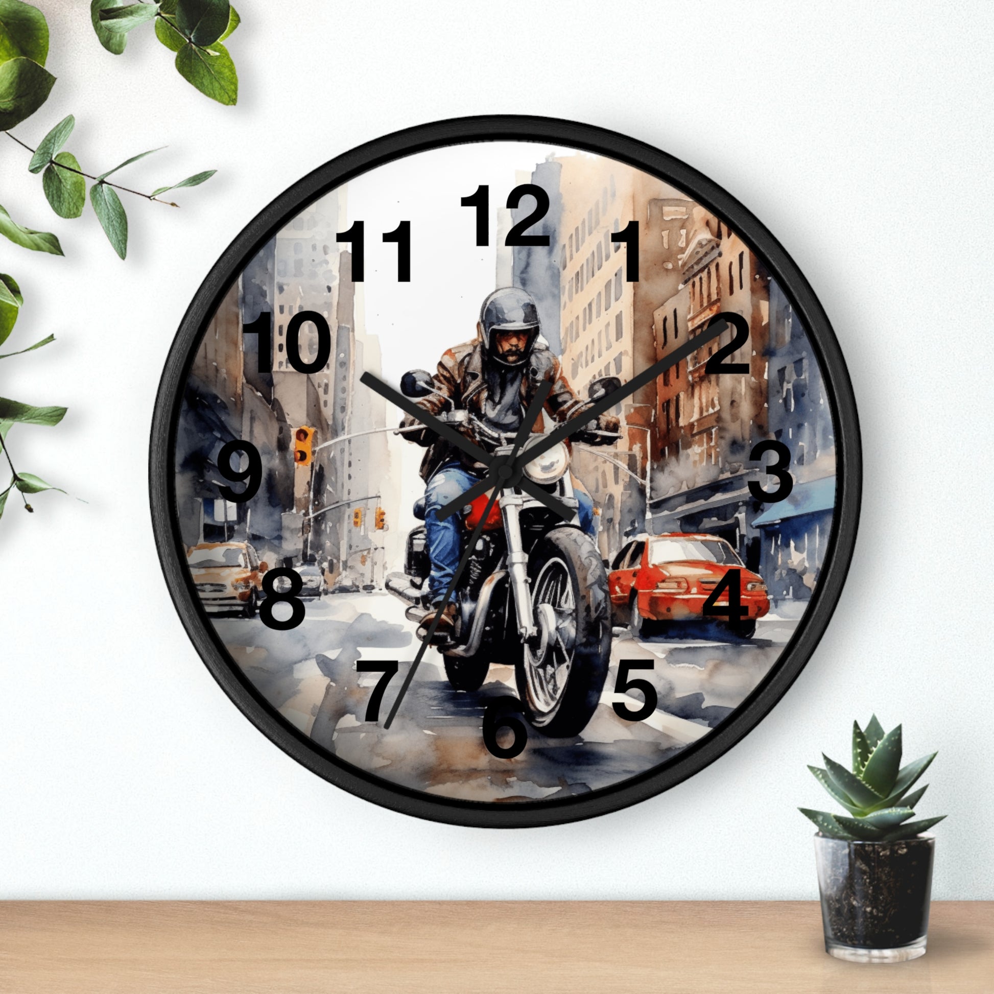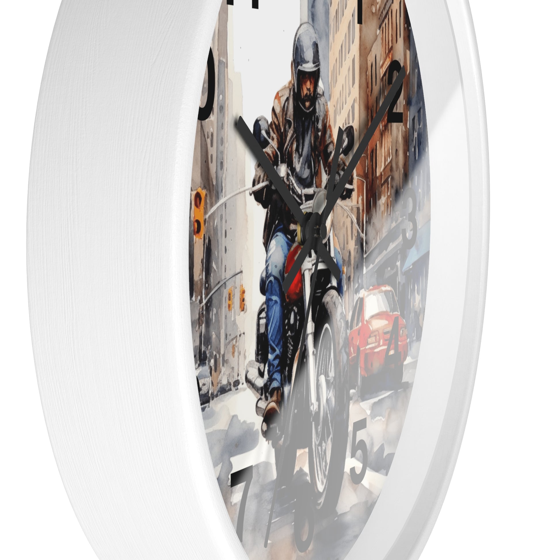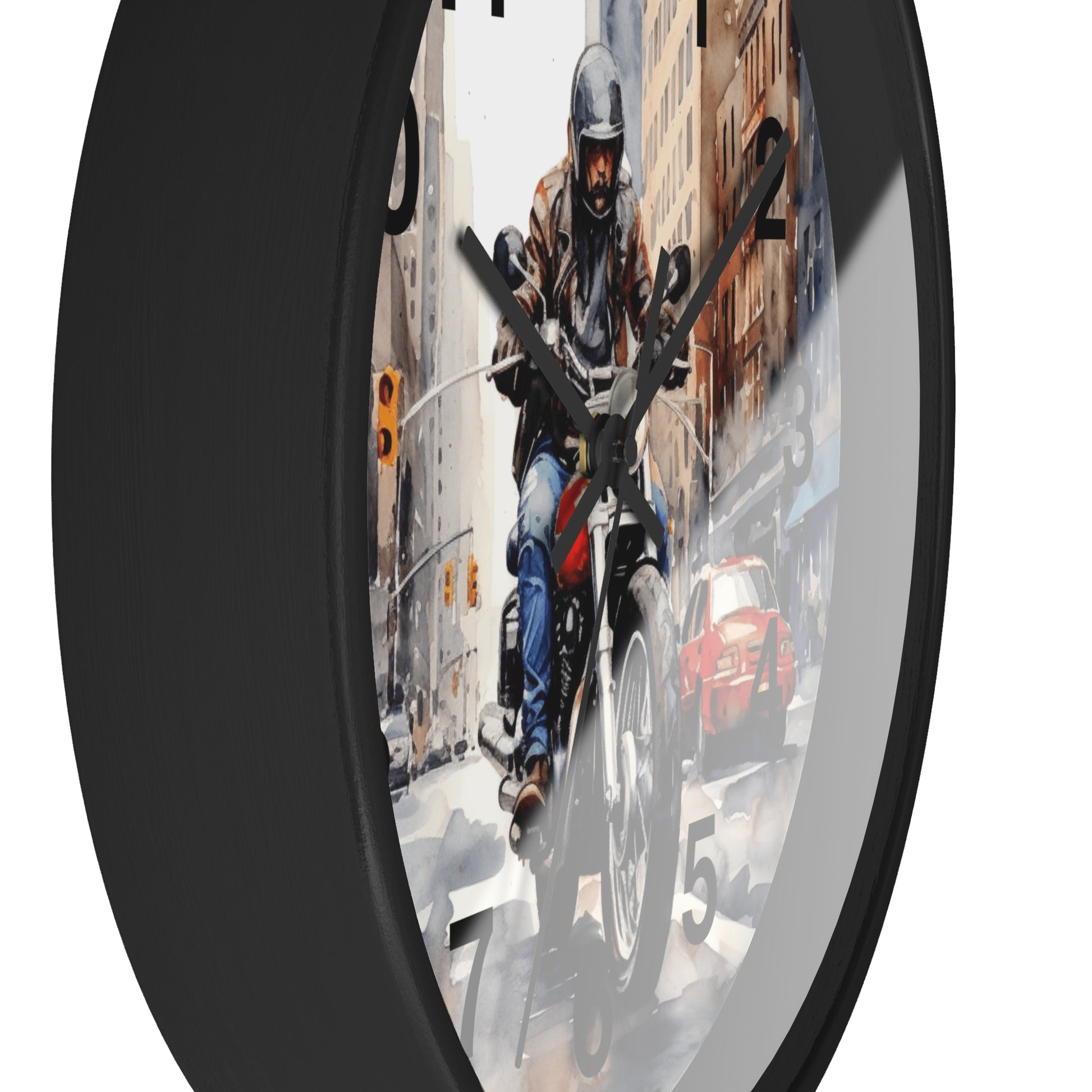 City Street Motorcycle Wall Clock | Urban Biker Decor | Rider Through City Art | Unique Gift for Bikers Cool Man Cave Clock Battery Operated