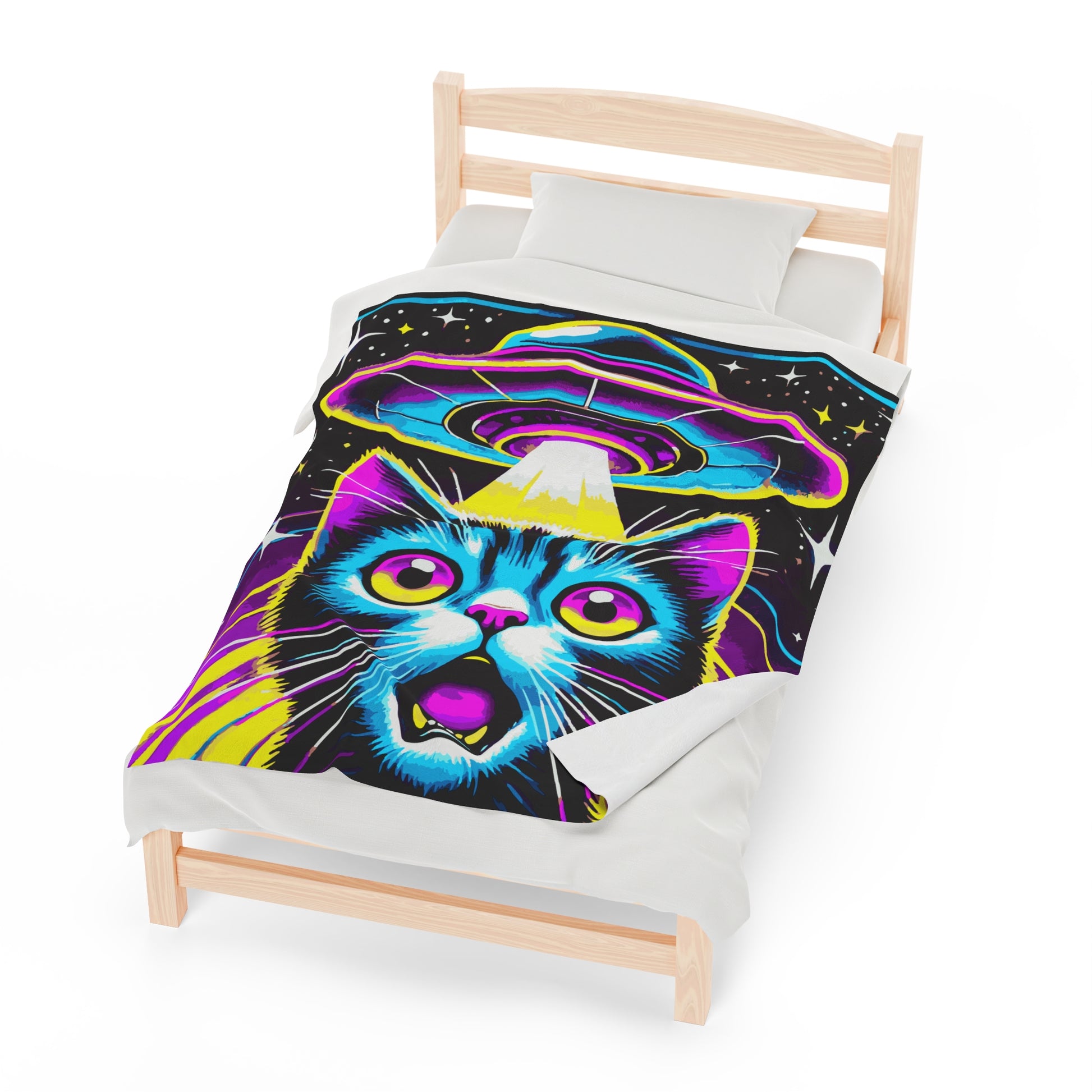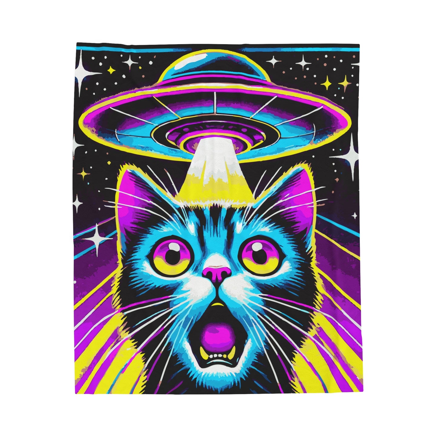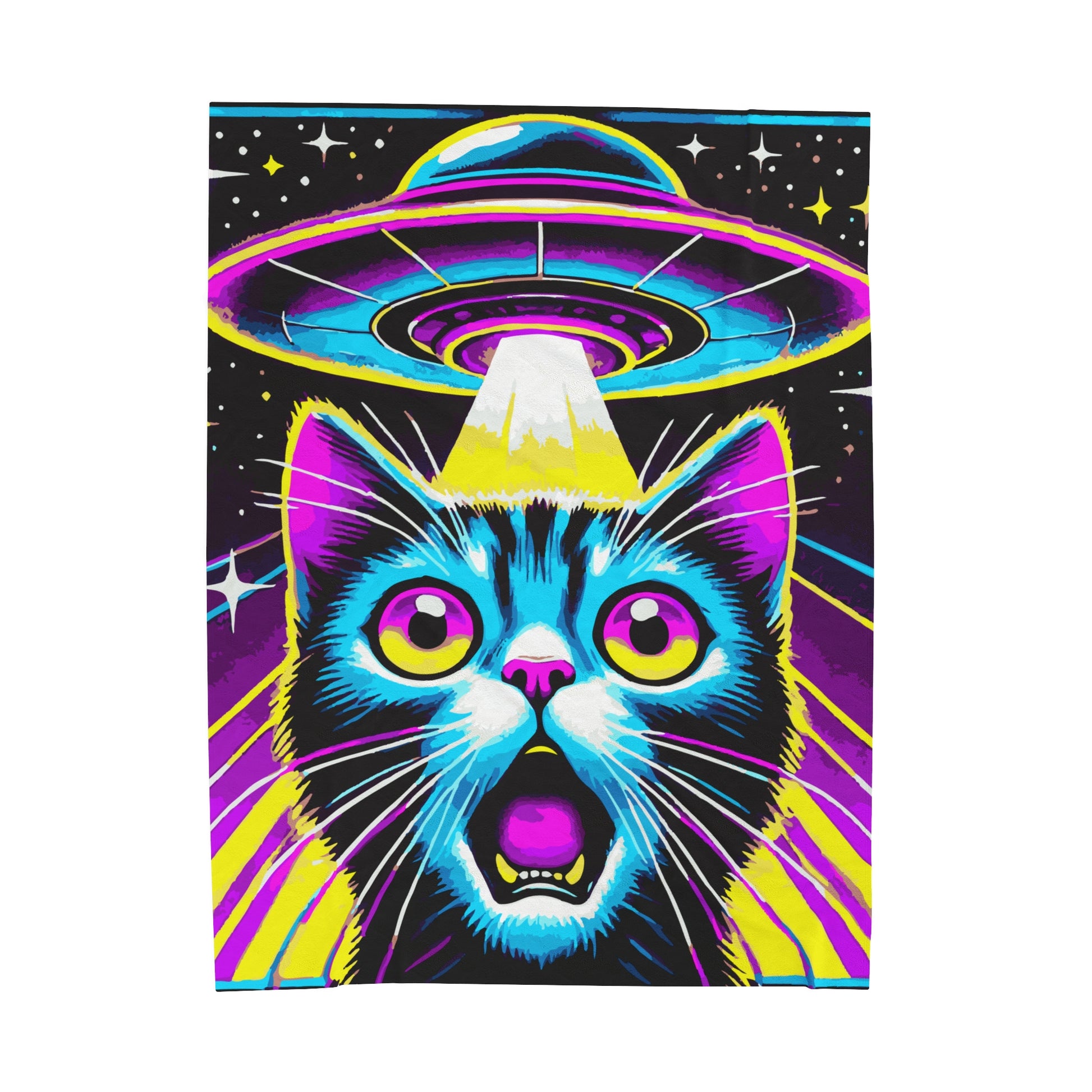 Colorful Cat Abduction Velveteen Plush Throw Blanket | Cool Cat Picked Up by Spaceship | Trippy Alien Decor Cat Lovers Cozy Fun Blanket Gift