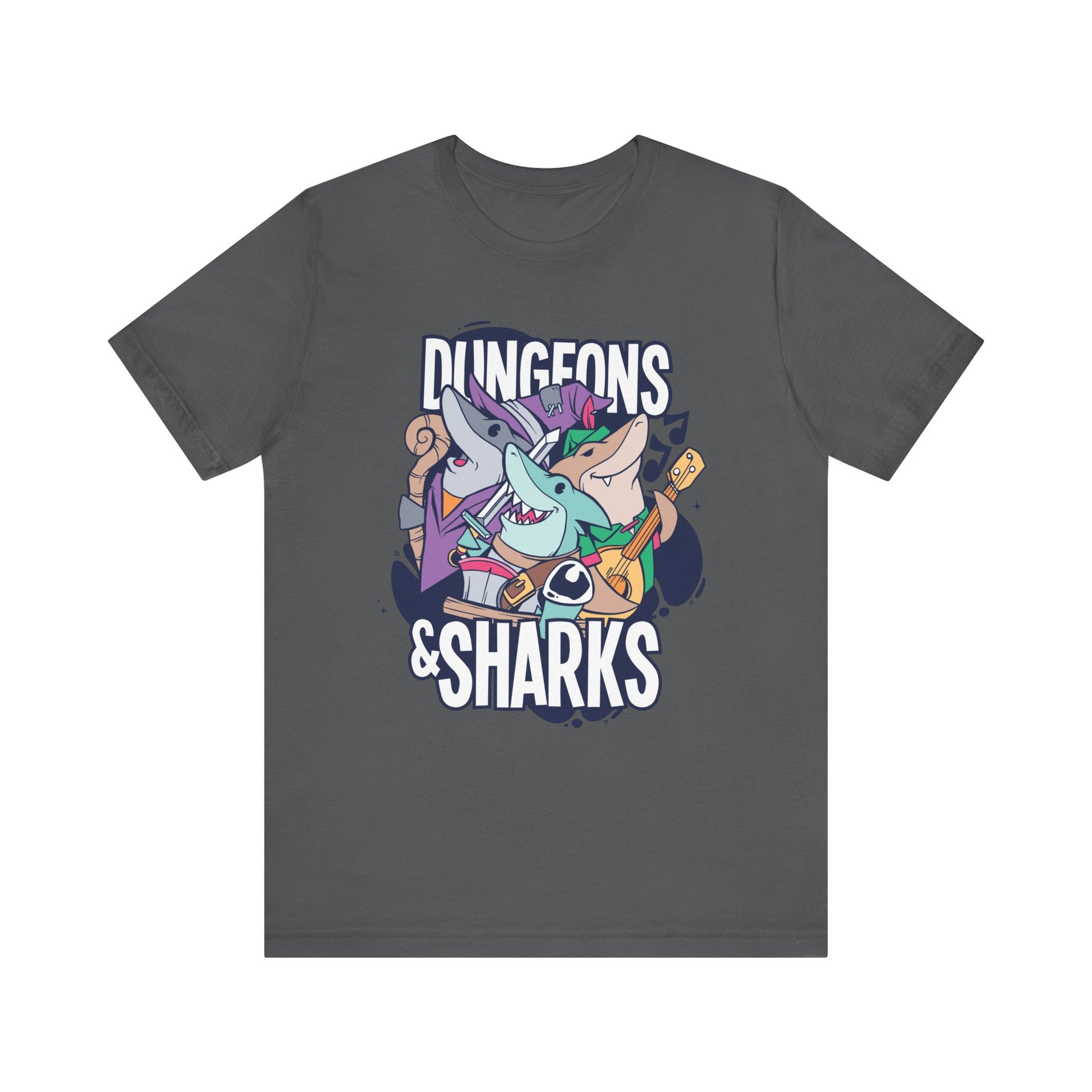 Dive into adventure with this Dungeons and Sharks tee—perfect for tabletop gamers and shark enthusiasts alike