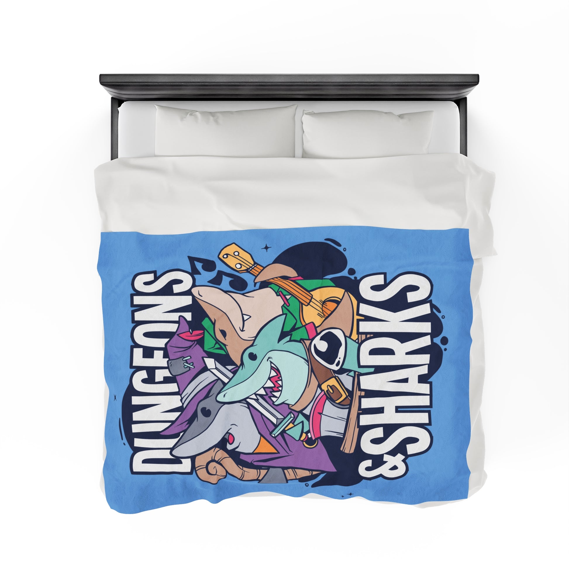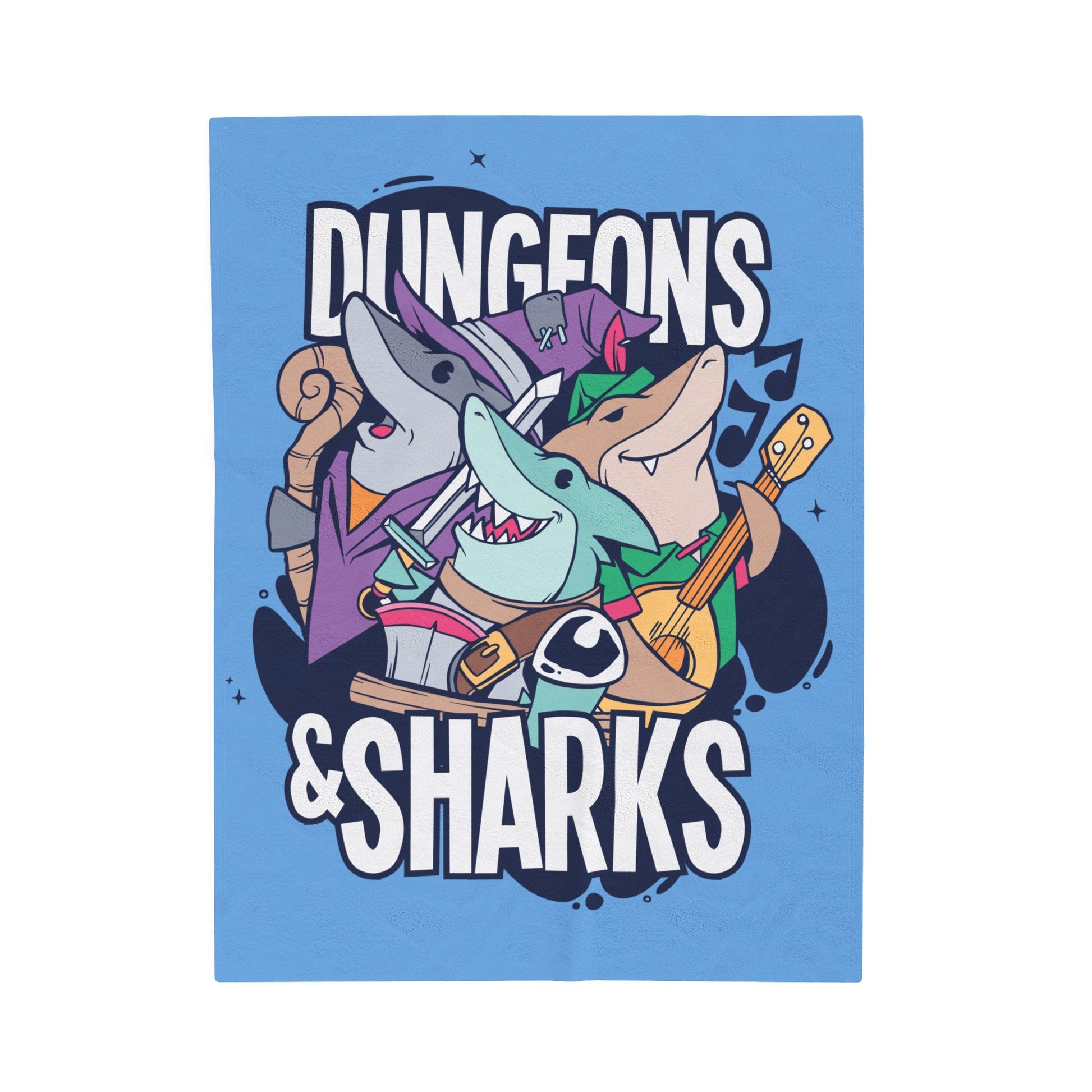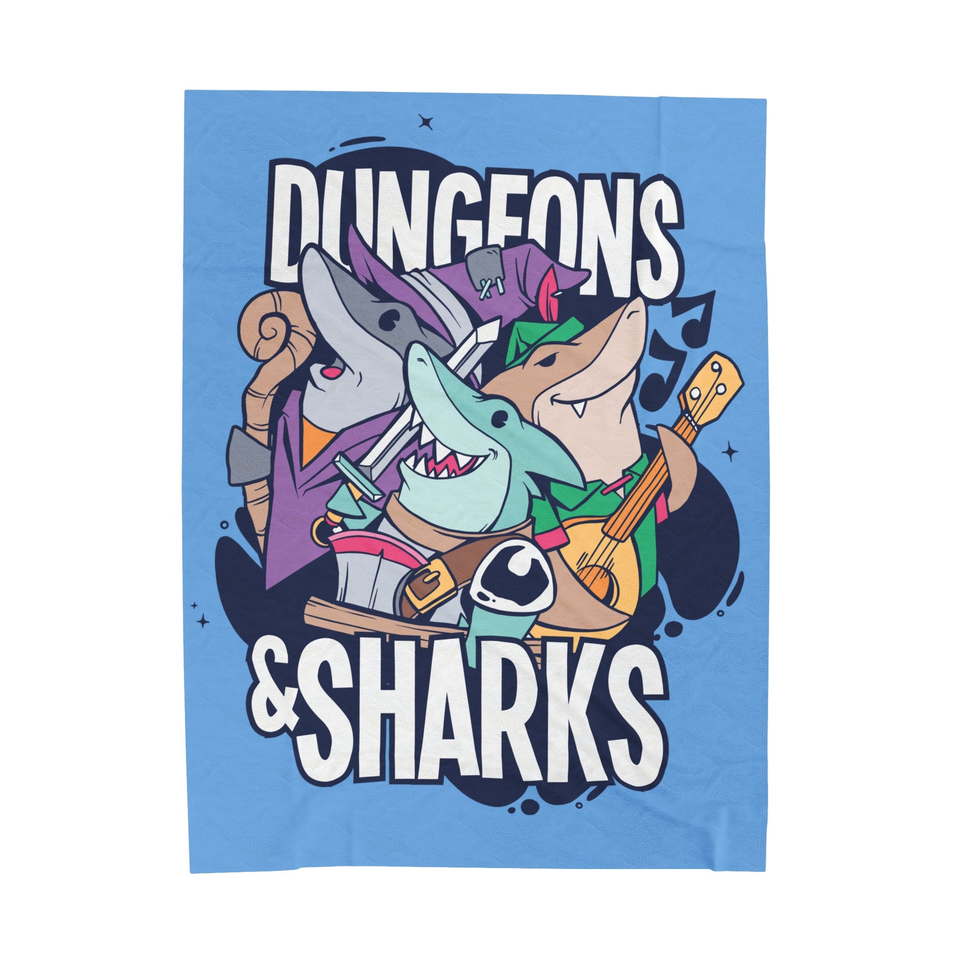 Dungeons and Sharks Velveteen Plush Throw Blanket | Funny Shark Lover Gift | Nerdy Parody Blanket | Fantasy Roleplaying Cozy Ocean Decor