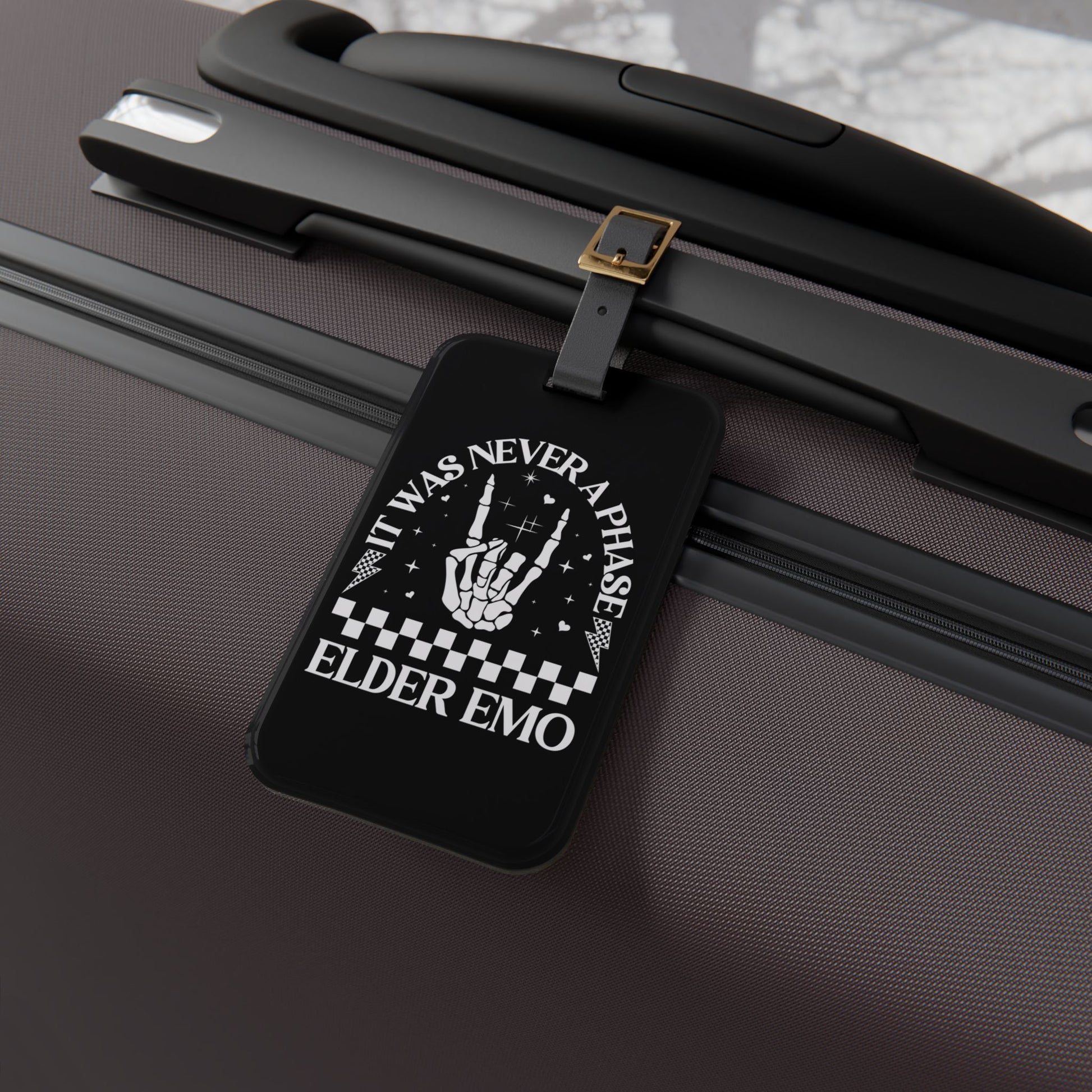 Elder Emo It Was Never a Phase Luggage Tag | Emo Culture Travel Accessory | Gothic Punk Baggage ID Dark Aesthetic Gift Elder Emo Fans Black