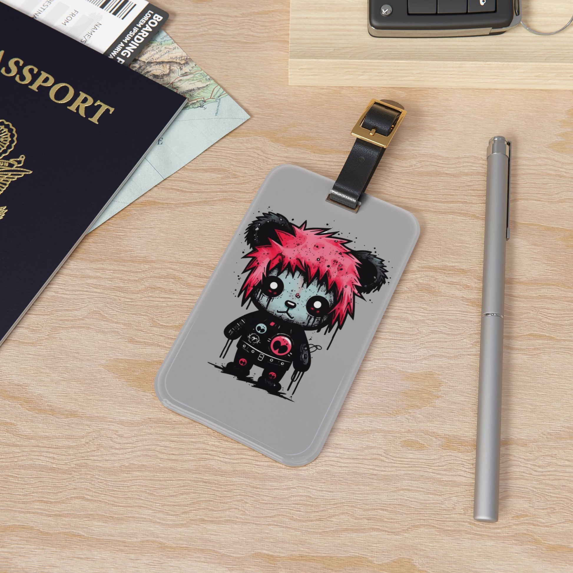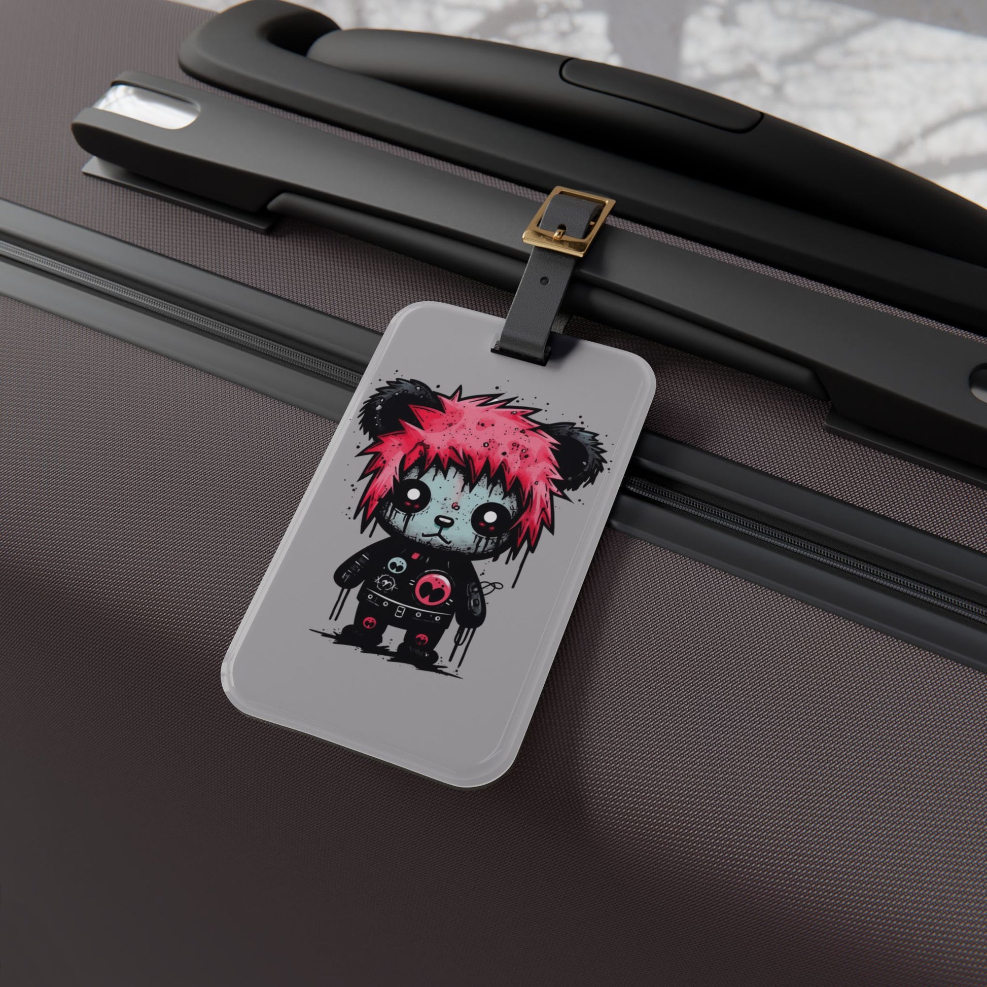 Emo Grunge Pink Hair Death Stare Bear Luggage Tag | Edgy Streetwear Travel Accessory | Alternative Fashion Baggage ID | Goth Bear Elder Emo