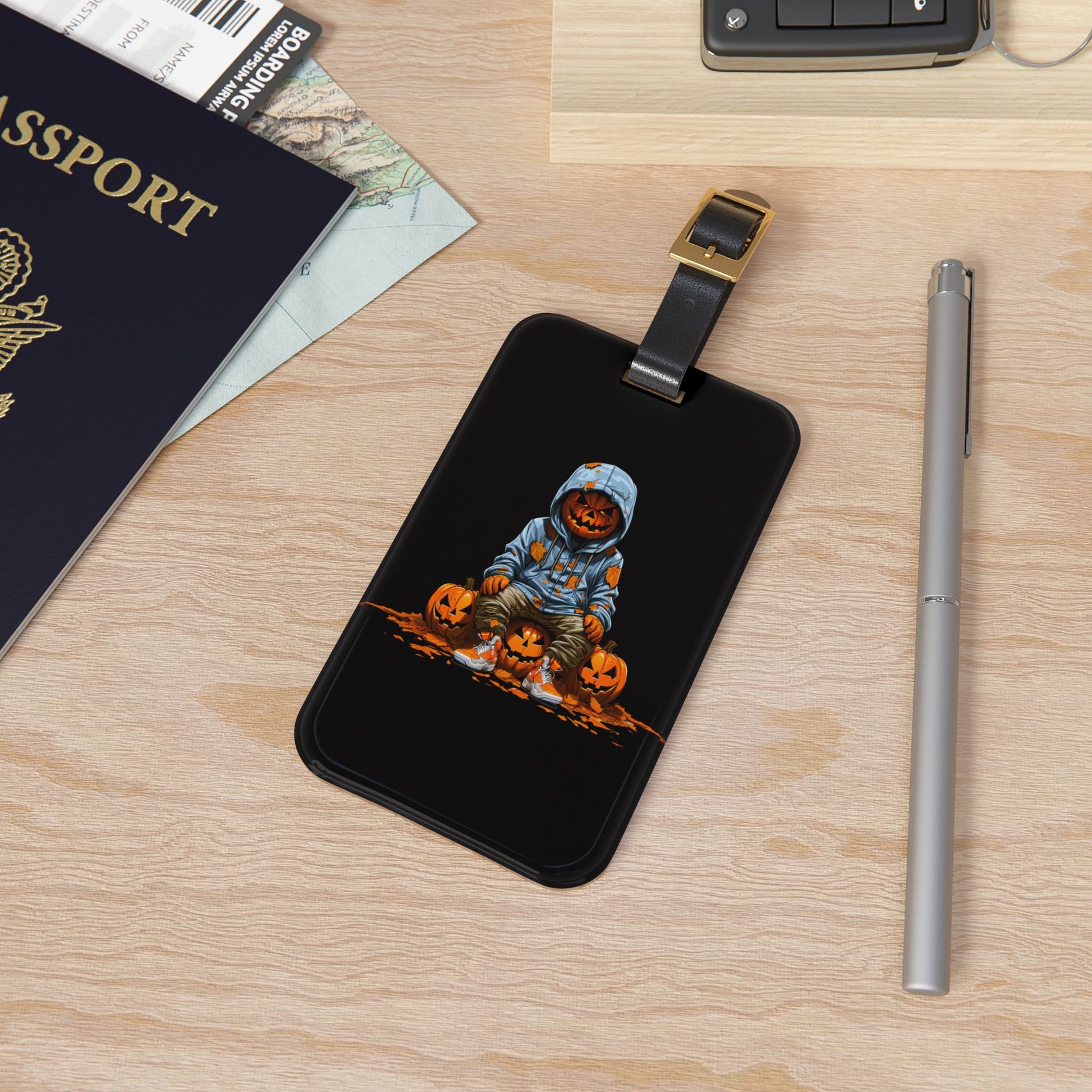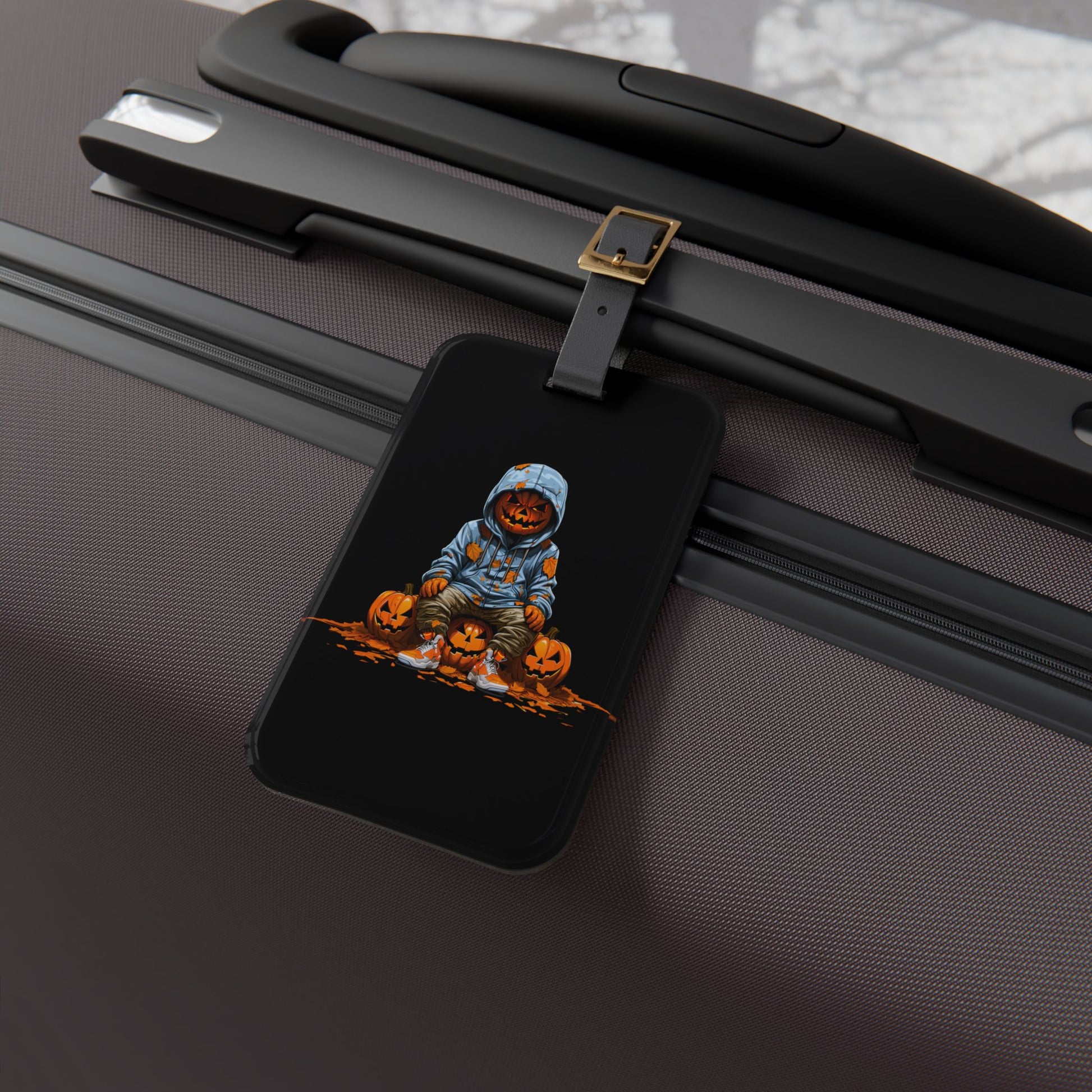 Gangster Pumpkin Blue Hoodie Luggage Tag | Urban Style Jack O Lantern Streetwear | Halloween Inspired Baggage ID | Street Culture Pumpkin