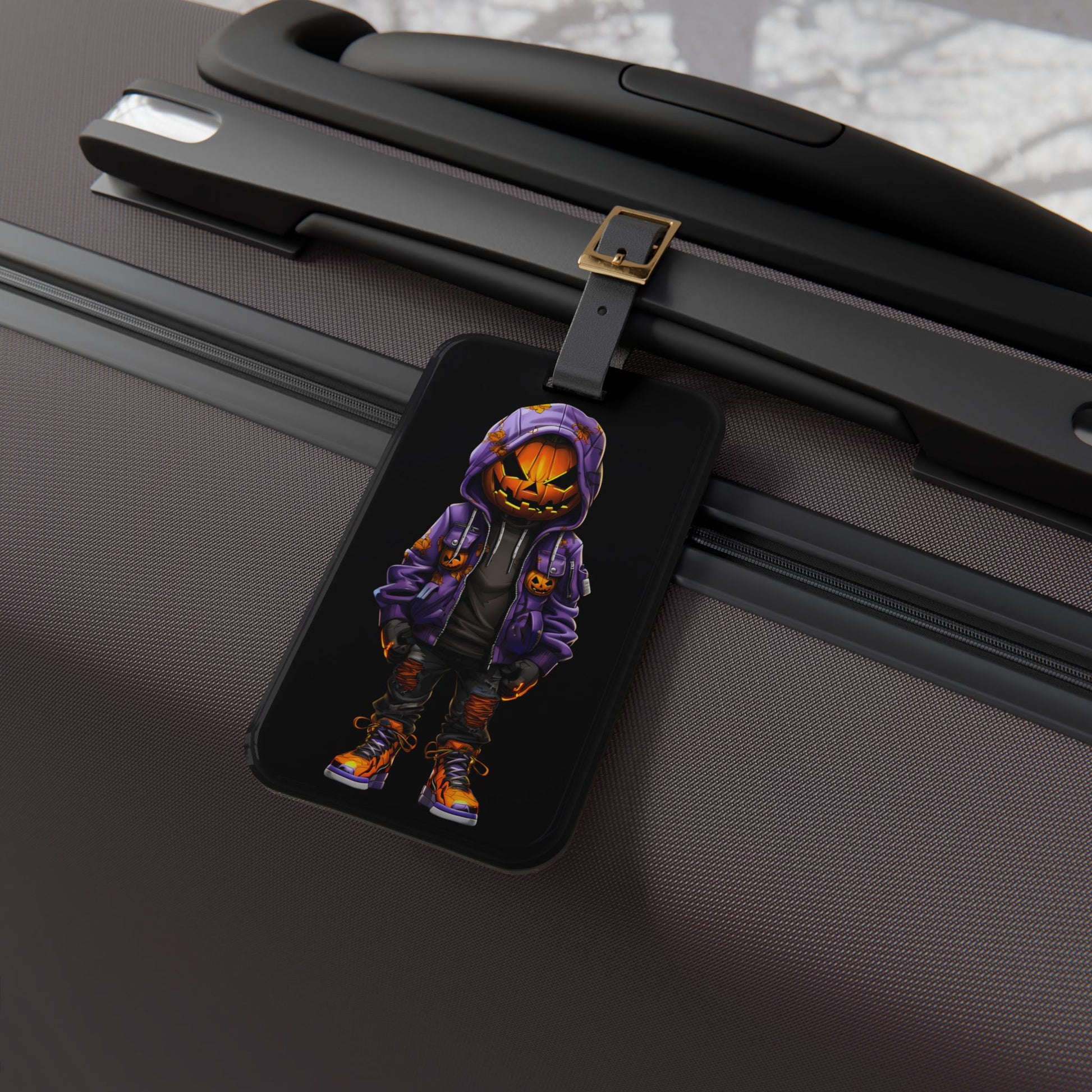 Gangster Pumpkin Purple Orange Hoodie Luggage Tag Urban Style Jack O Lantern Streetwear Halloween Inspired Baggage ID Street Culture Pumpkin