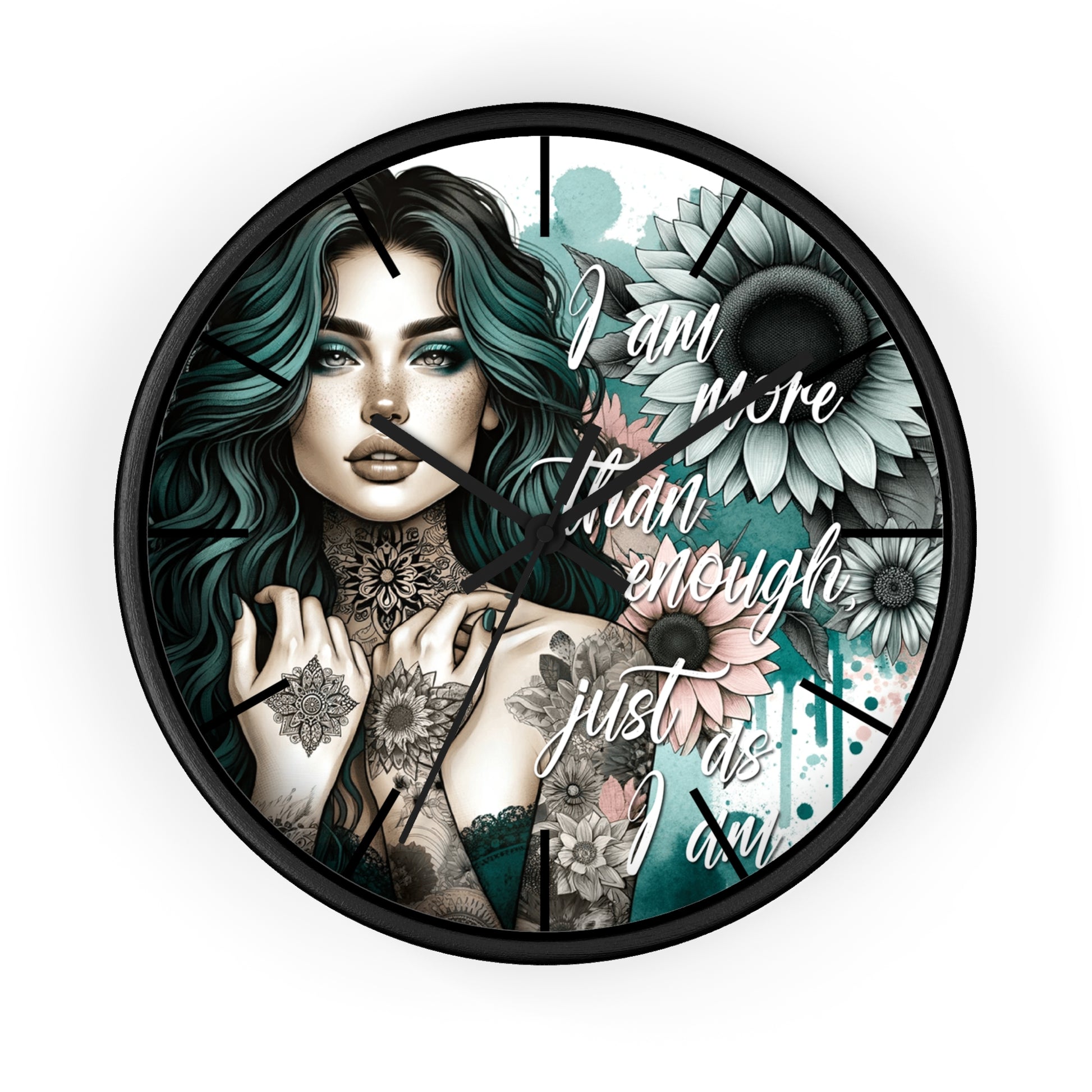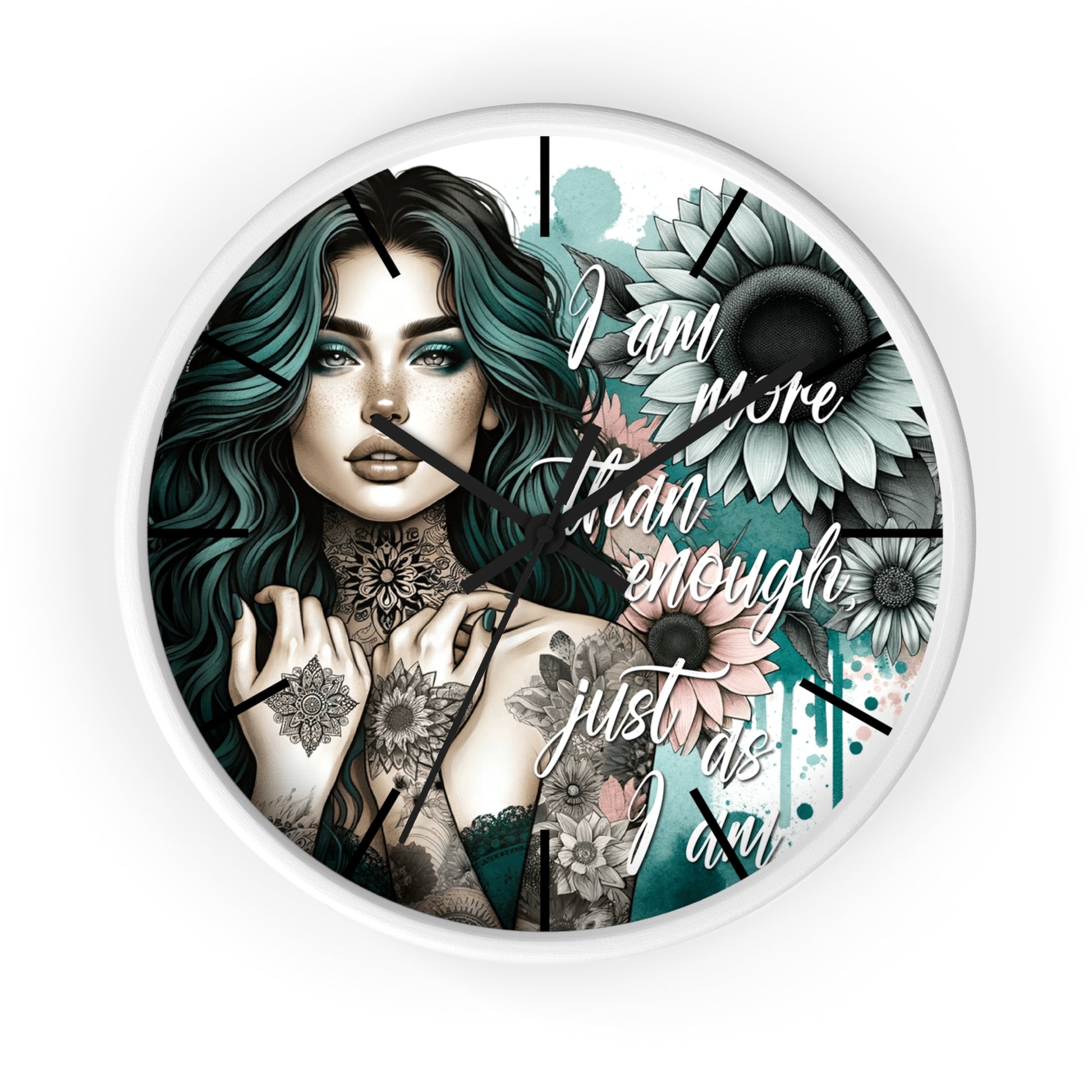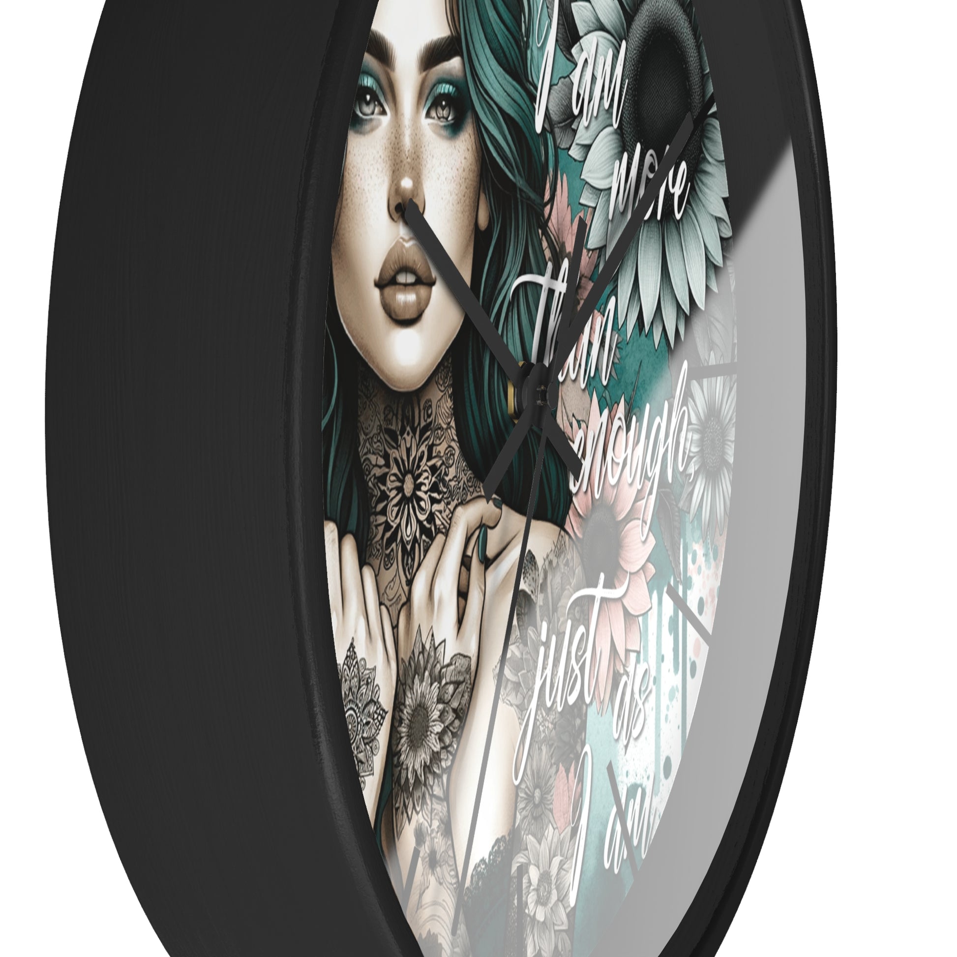 I Am More Than Enough Wall Clock | Affirmation Quote Art | Battery Operated Beautiful Woman with Flowers Dark Aesthetic Manifestation Decor