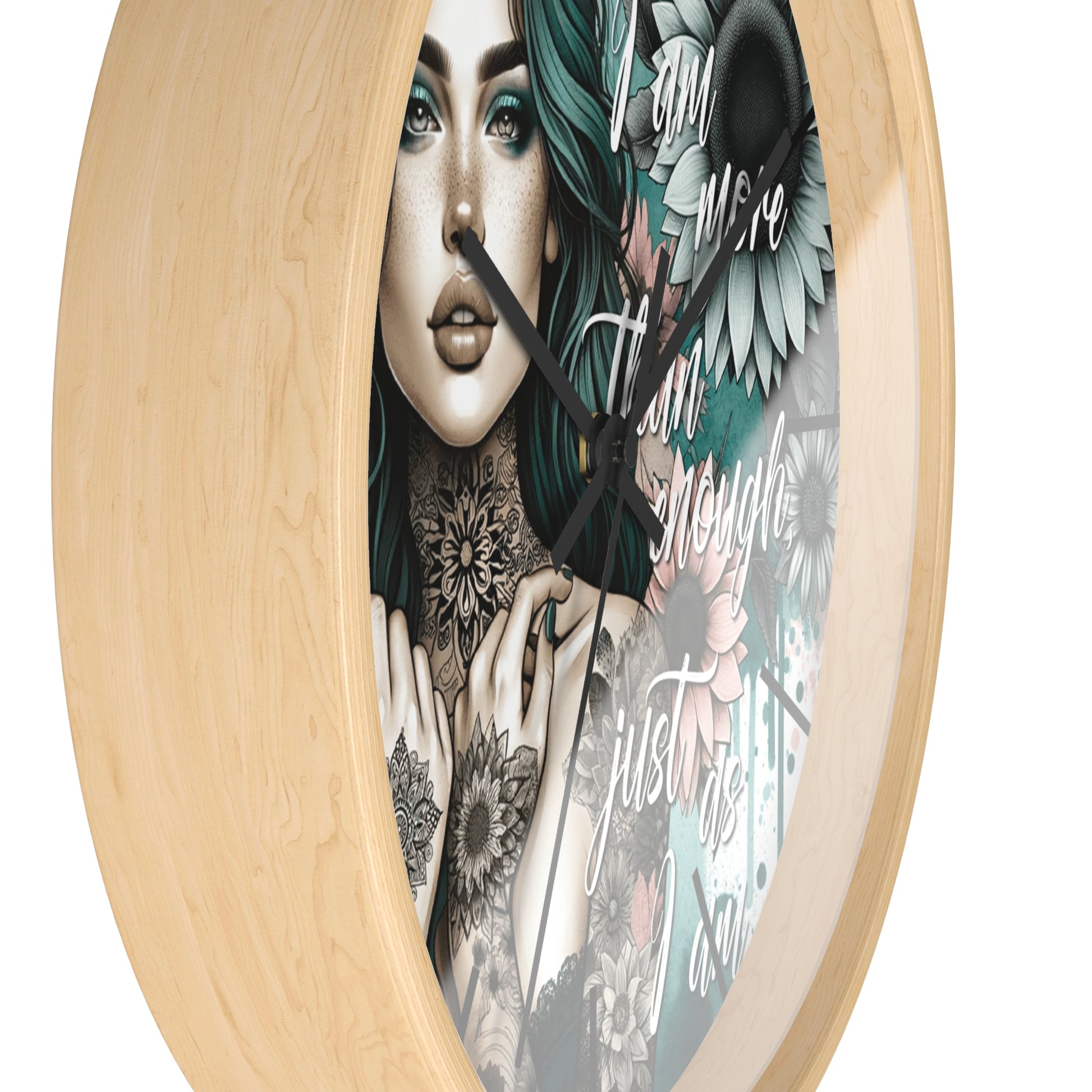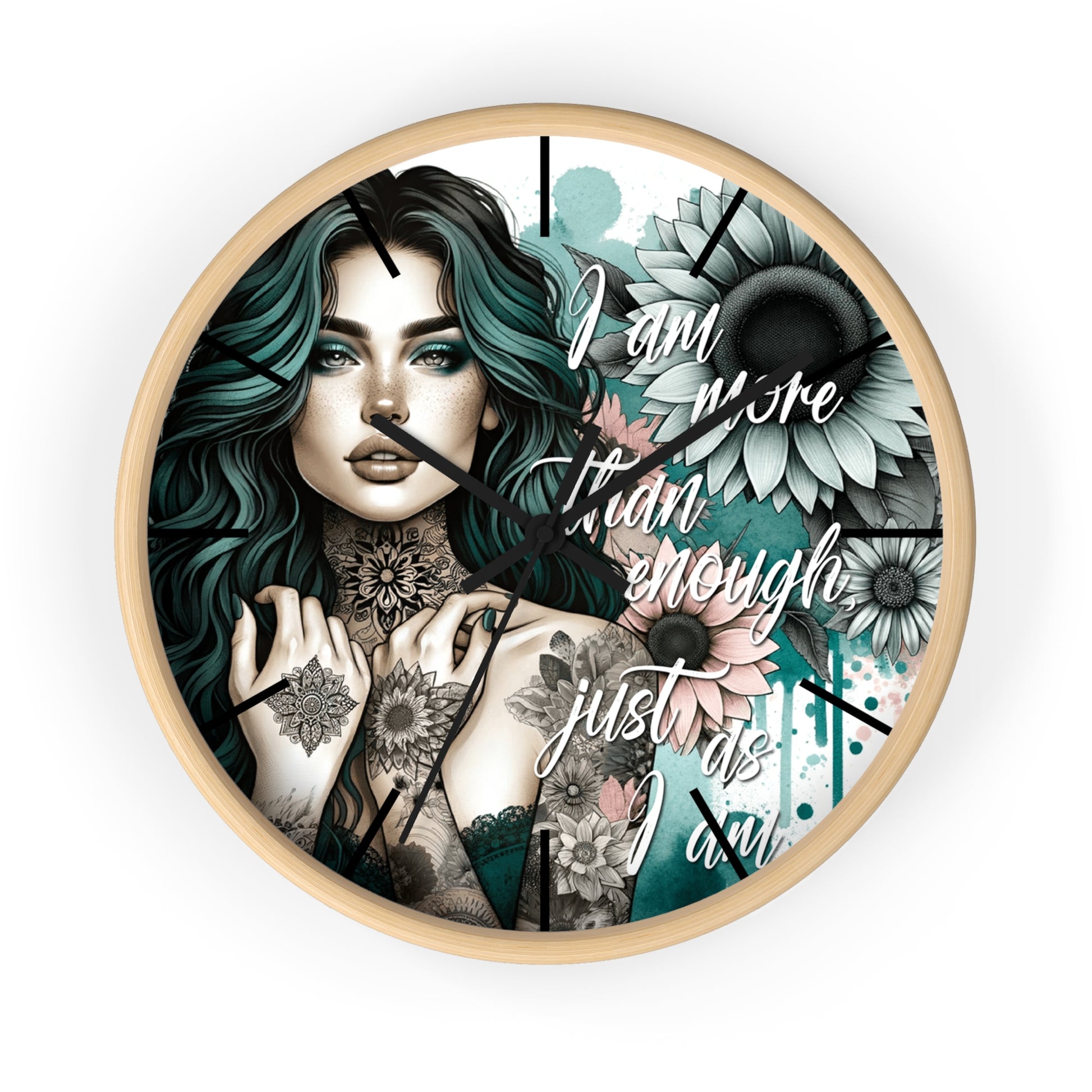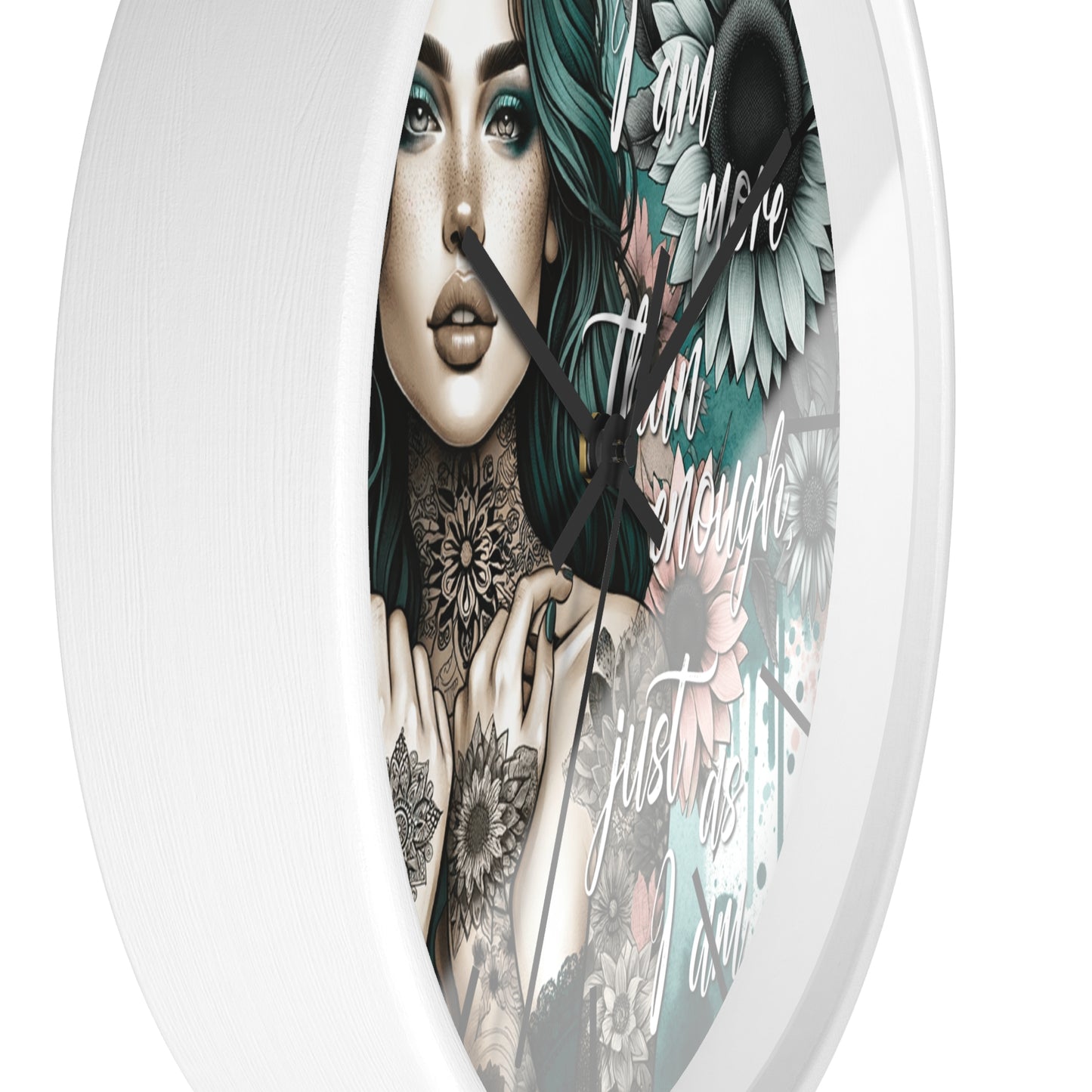 I Am More Than Enough Wall Clock | Affirmation Quote Art | Battery Operated Beautiful Woman with Flowers Dark Aesthetic Manifestation Decor