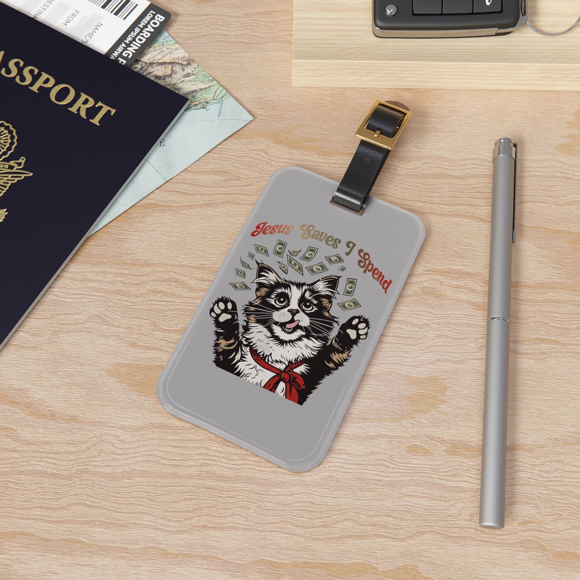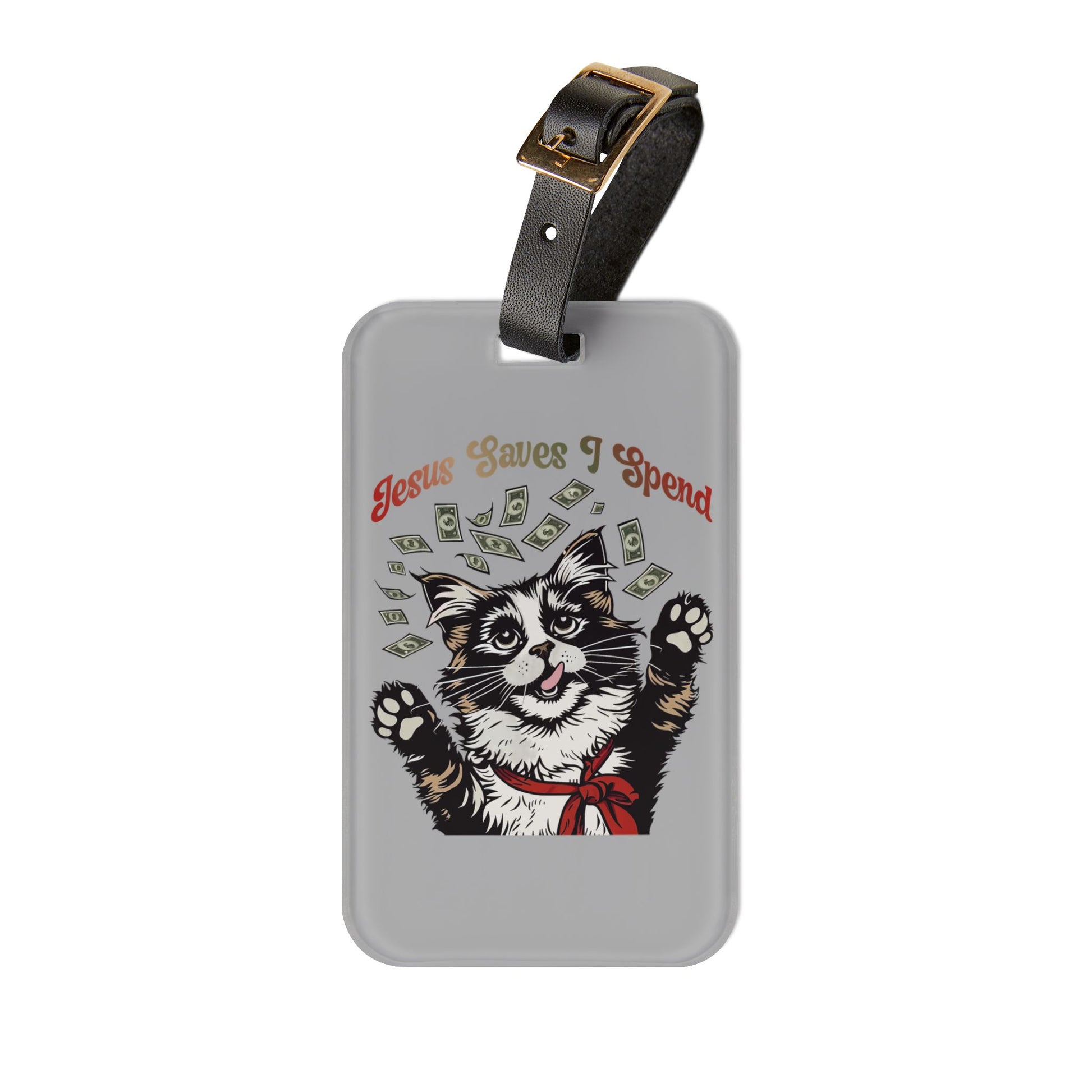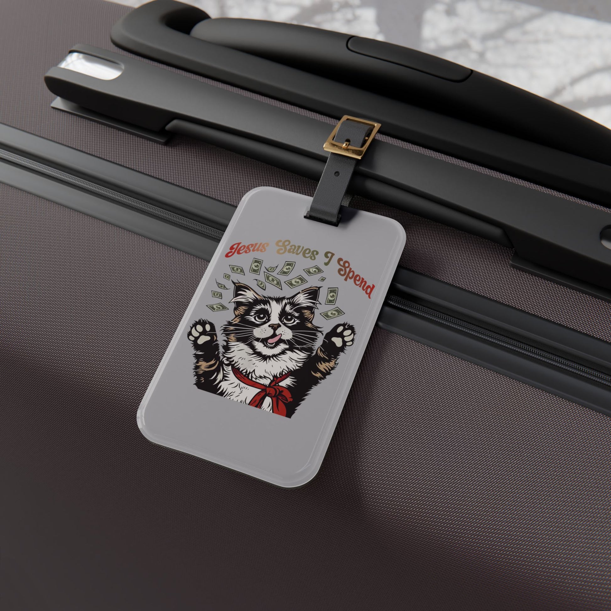 Jesus Saves I Spend Luggage Tag | Funny Cat Money Baggage ID Gen Z Quotes Zoomer Humor Trendy Sassy Animal Vibes Cat Gift Travel Accessory