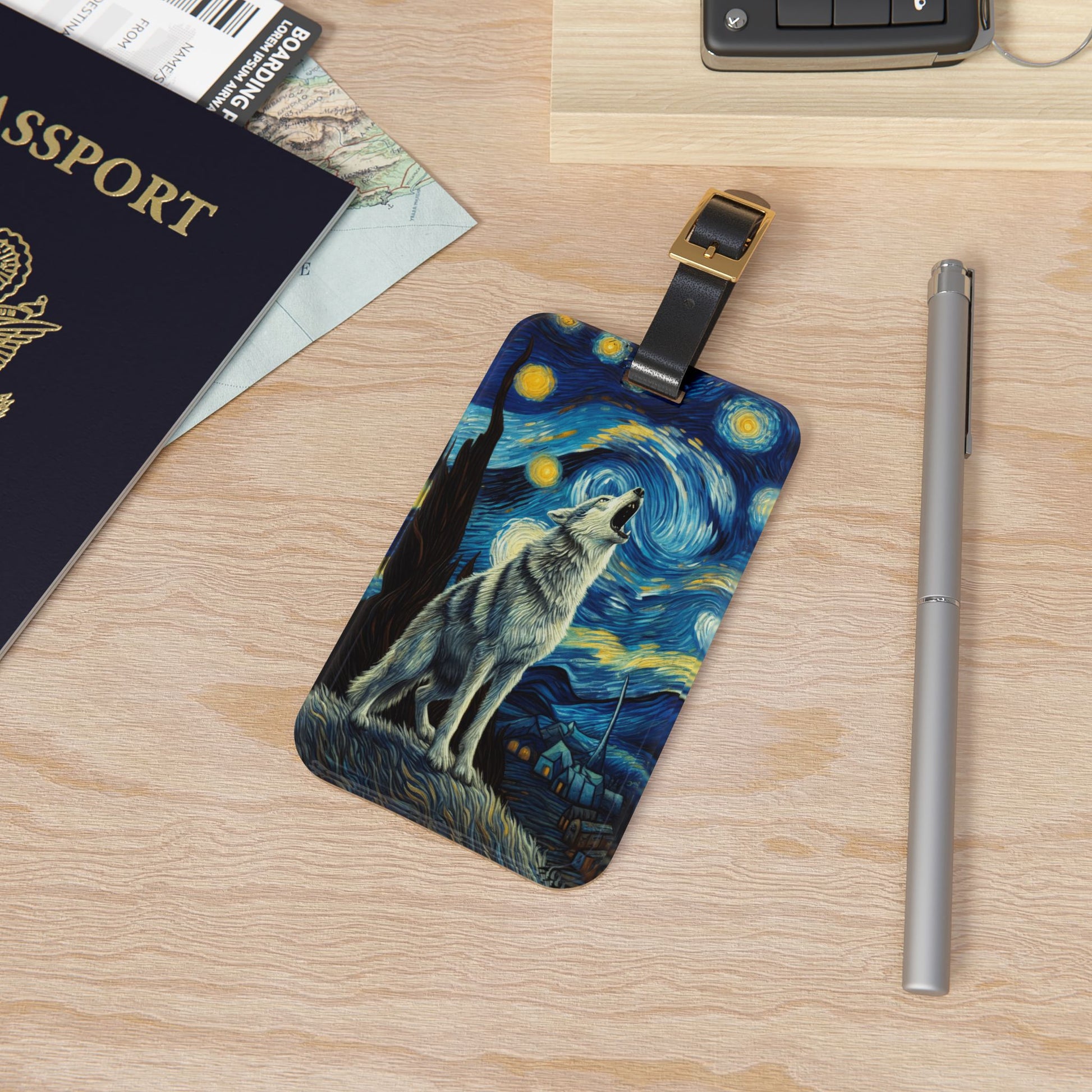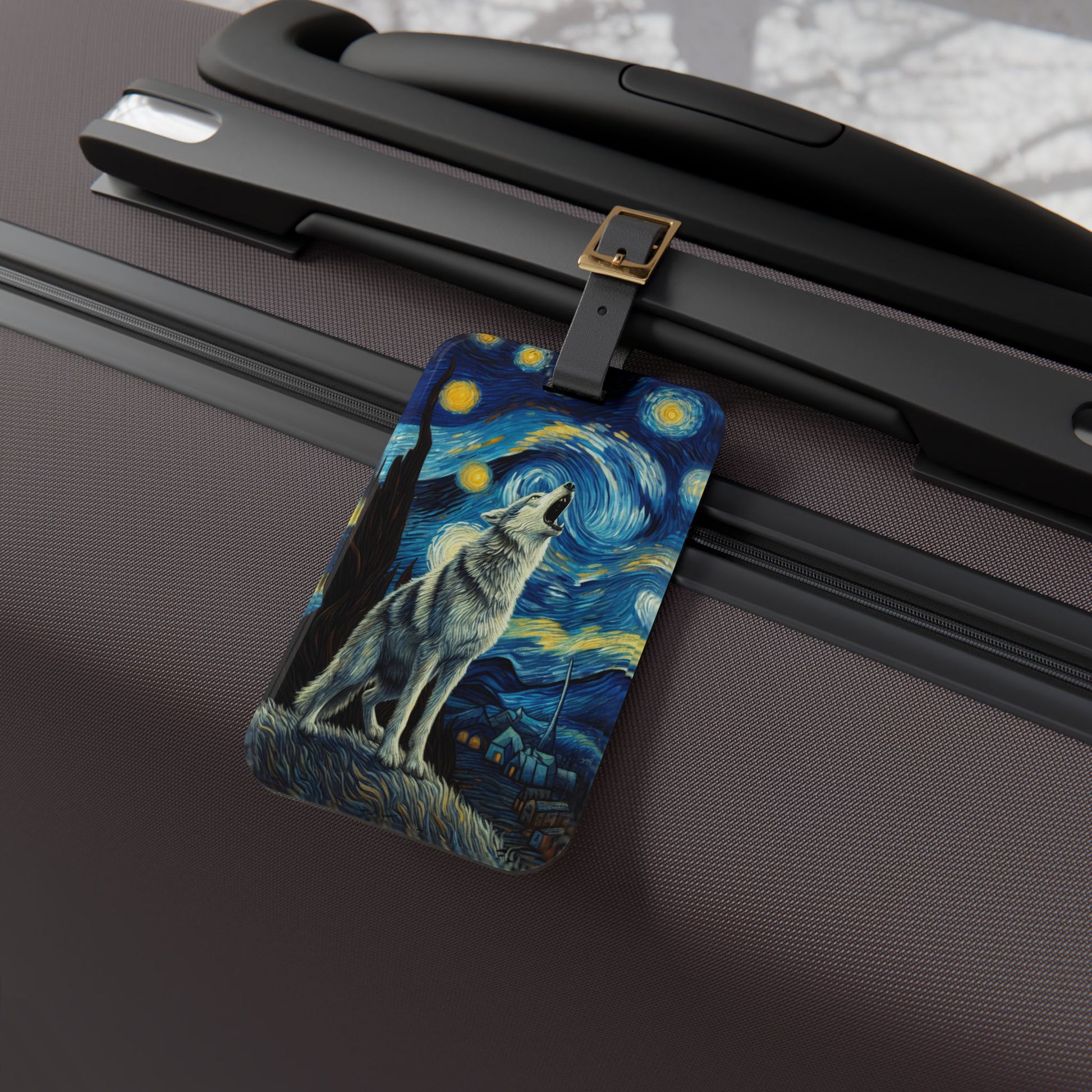 Lone Wolf Night Sky Luggage Tag | Starry Night-Inspired Travel Accessory | Mystical Wolf Baggage ID | Nature & Wilderness Lover Gift