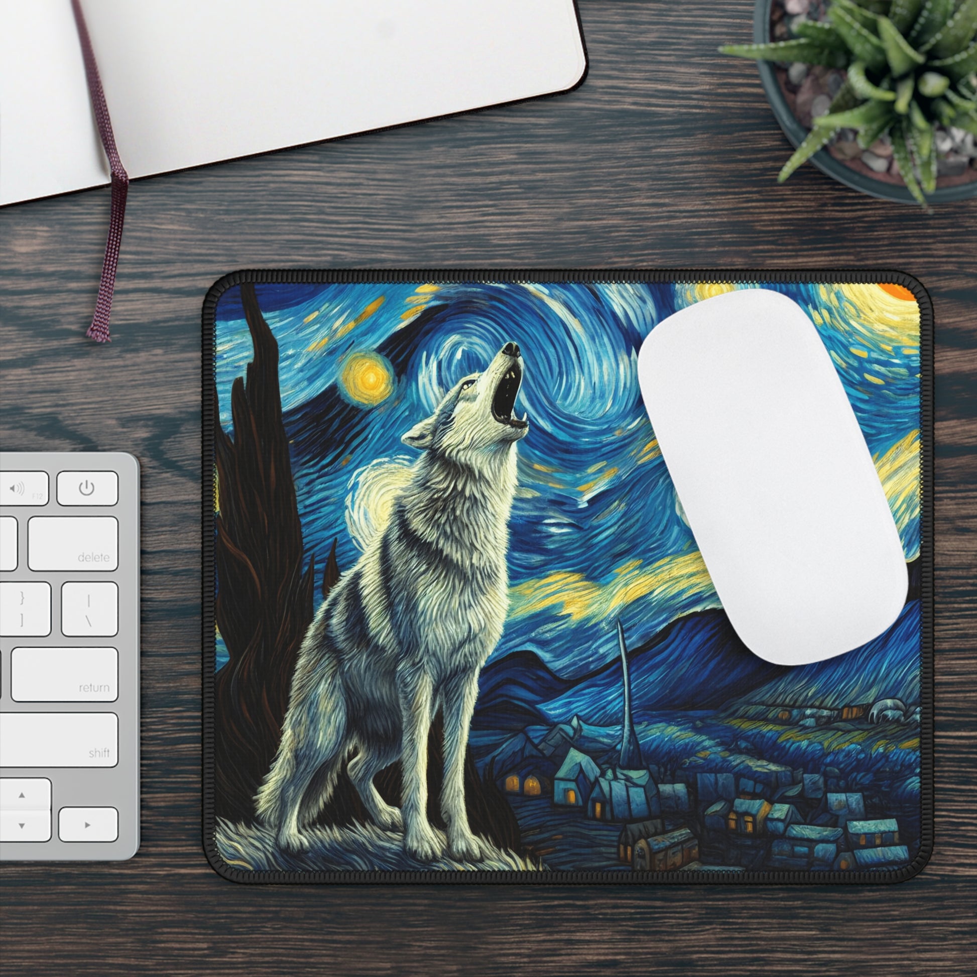 Lone Wolf Night Sky Non-Slip Mouse Pad | Starry Night-Inspired Art | Mystical Wolf Lover Desk Mat for Nature & Wilderness Enthusiasts