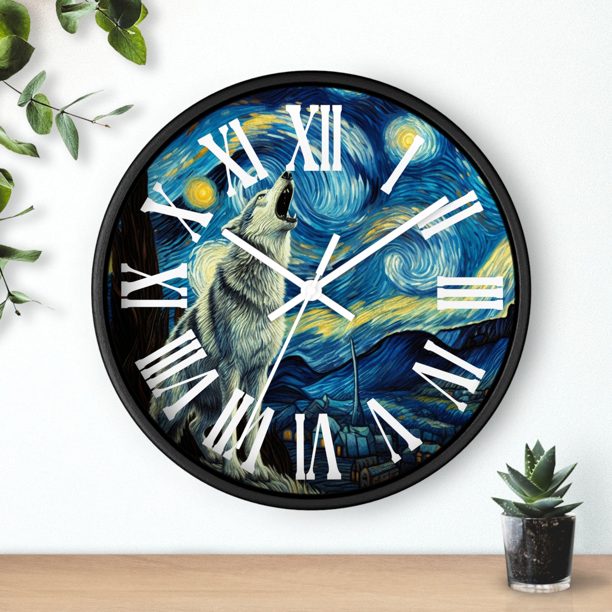 Lone Wolf Night Sky Wall Clock Roman Numeral | Battery Operated | Starry Night-Inspired Art Gift Wolf and Nature Lovers Wall Decor Wolf Gift