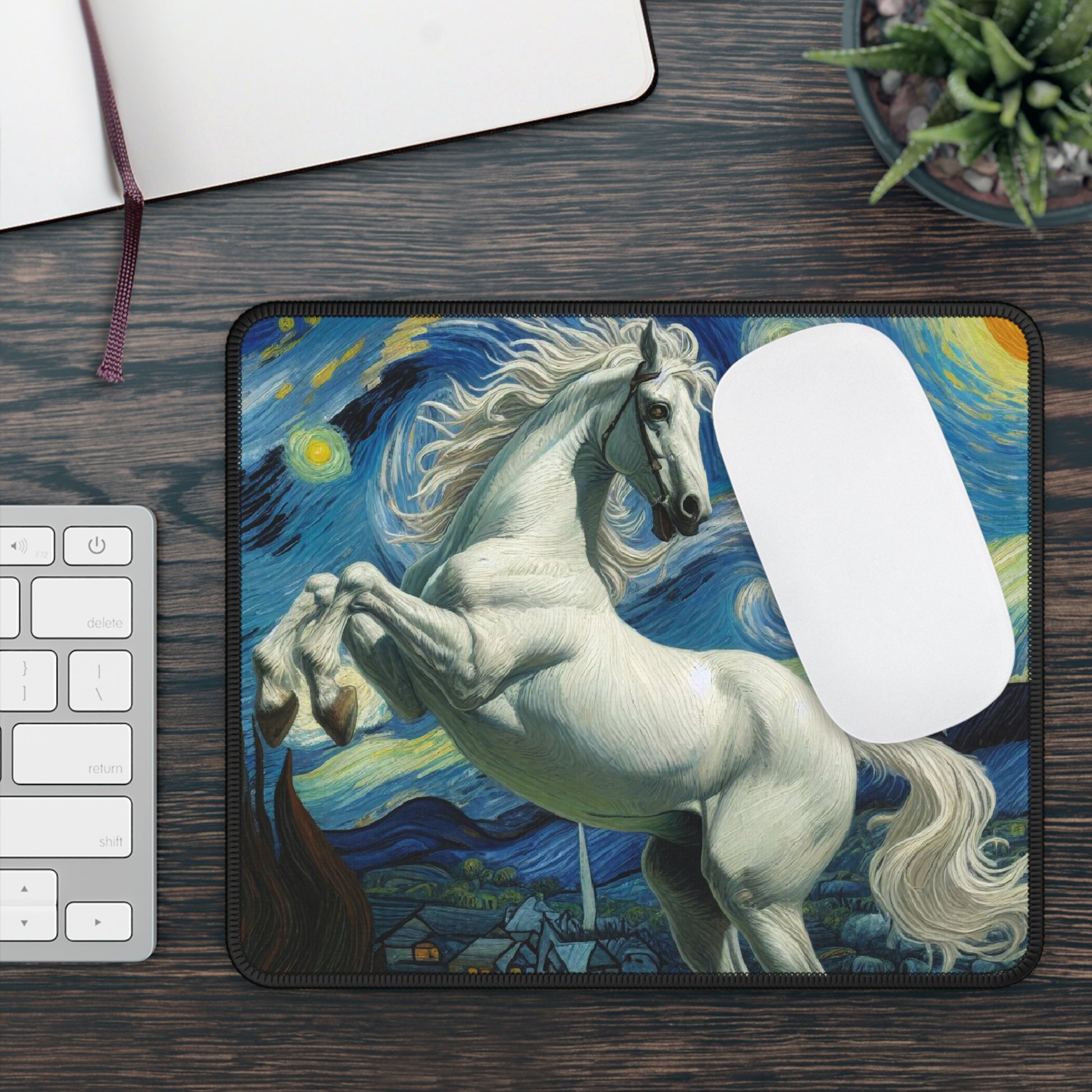 Elevate your desk decor with this stunning non-slip mouse pad featuring a majestic white horse under a starry night sky, ideal for horse lovers