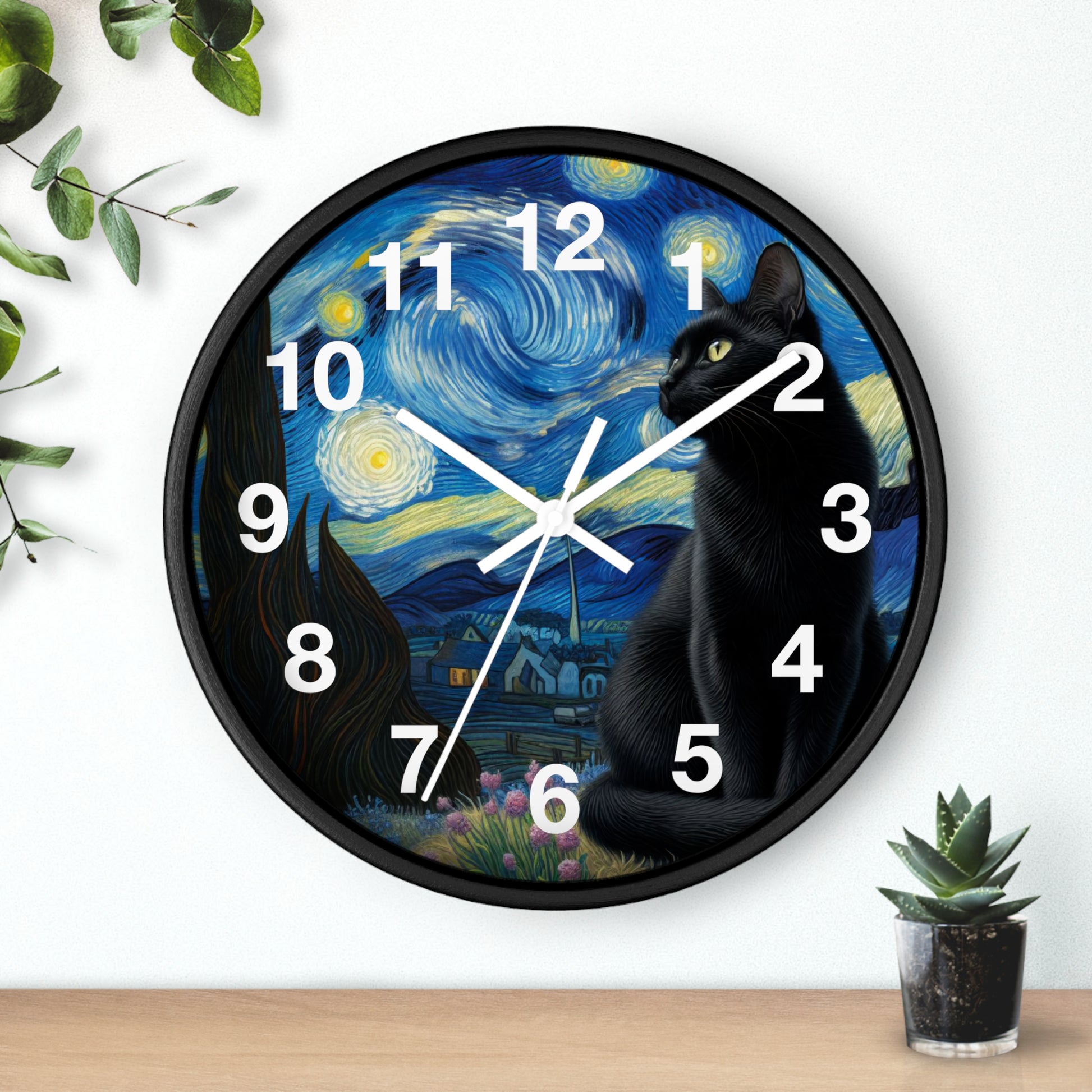 Mystical Black Cat Under Starry Night Wall Clock | Battery Operated | Enchanting Night Sky Art Perfect Gift Cat Lovers Witchcraft Wall Decor