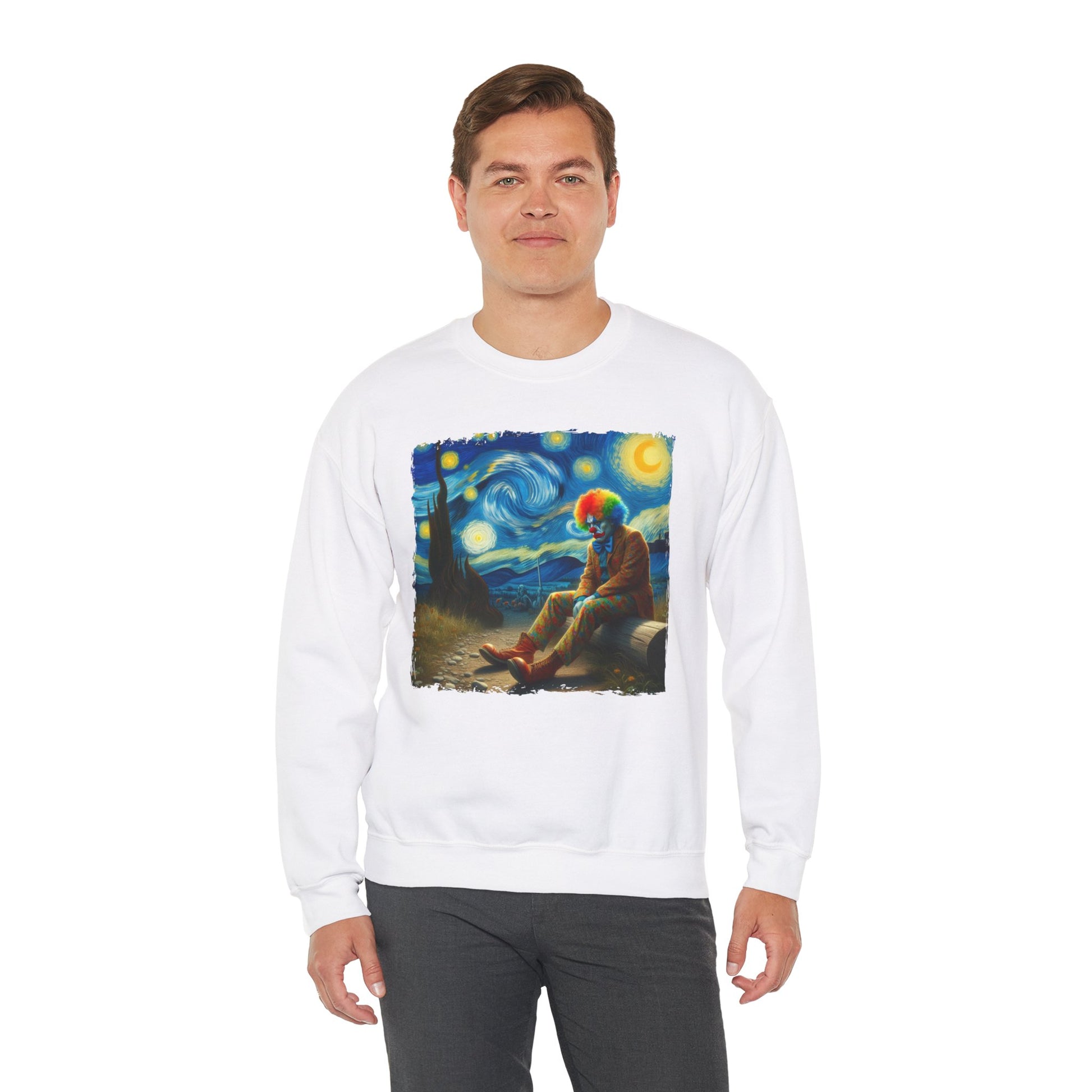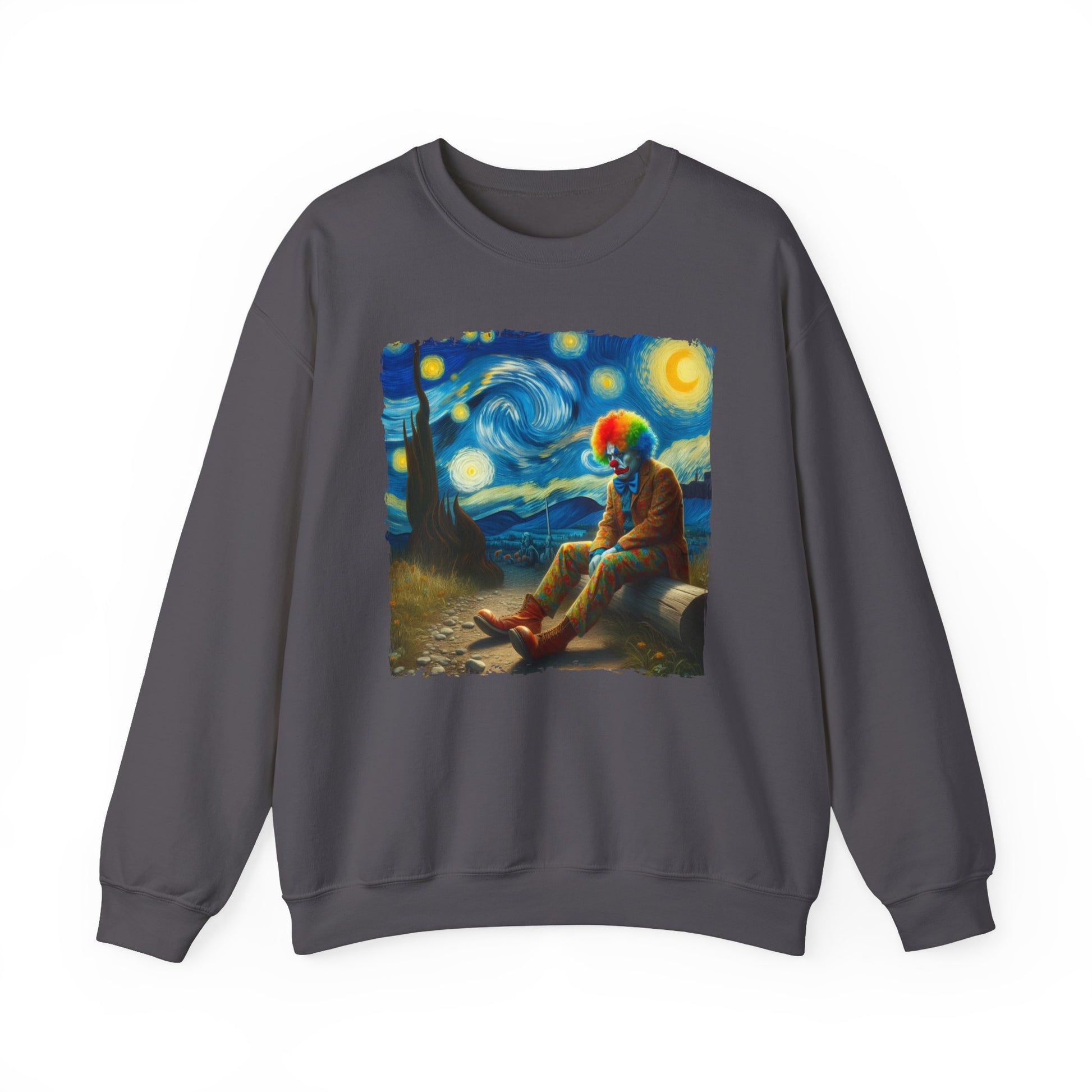 Sad Clown Night Sky Crewneck Sweater | Starry Night-Inspired Dark Humor Art | Unique Retro Clown Sweatshirt Circus Lovers | Hilarious Gift