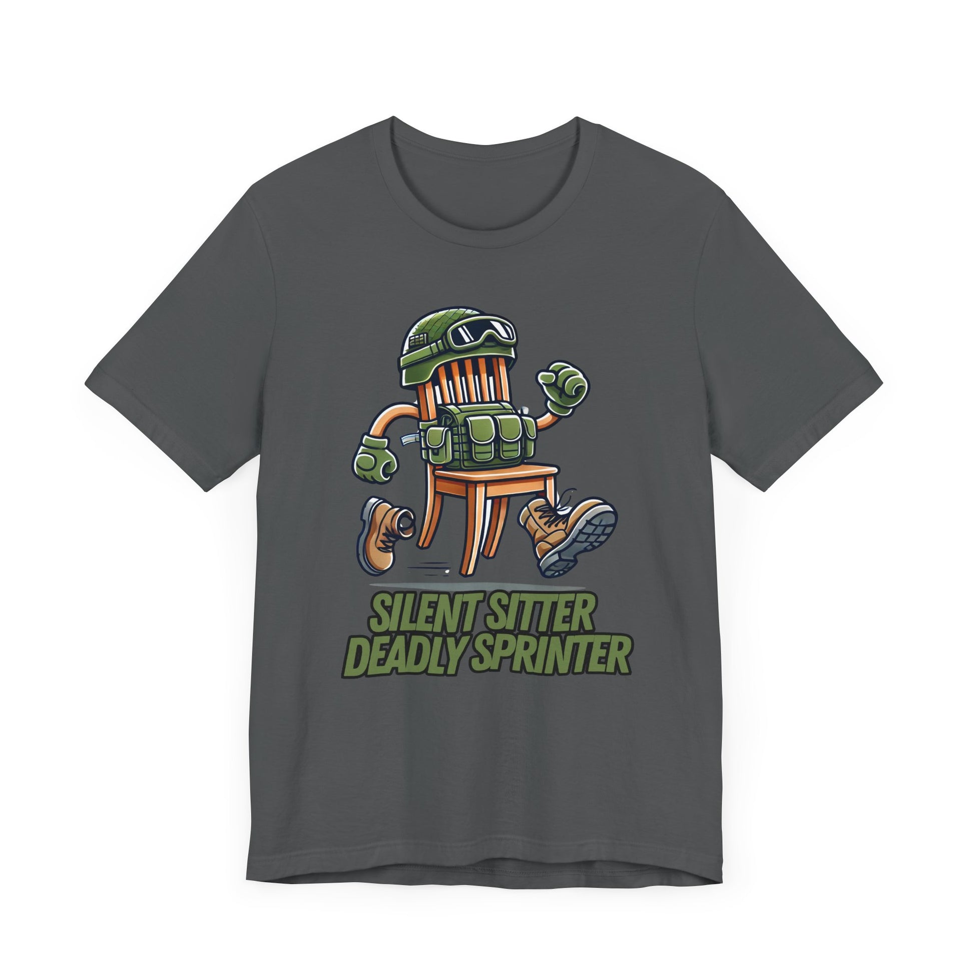 Silent Sitter, Deadly Sprinter | Tactical Chair Cartoon Art | Funny Prop Hunt Design | Unique Gamer Gift | Bold Military Chair Illustration