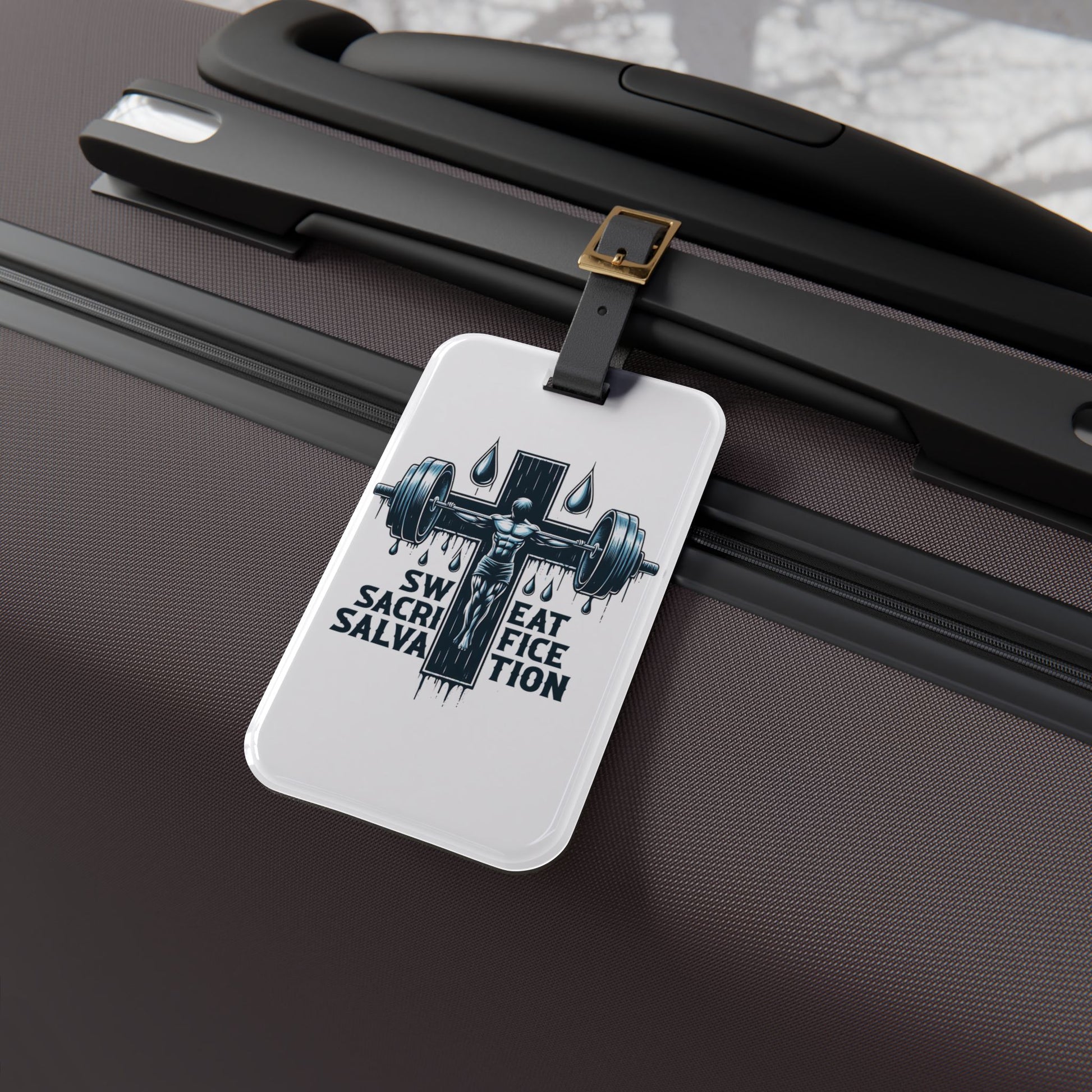 Sweat Sacrifice Salvation Jesus Cross Luggage Tag | Faith-Based Fitness Baggage ID Christian Gym Travel Accessory Inspirational Workout Gift