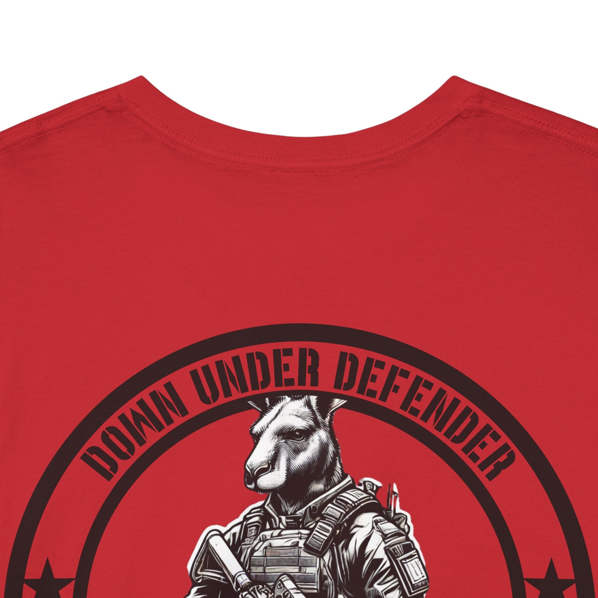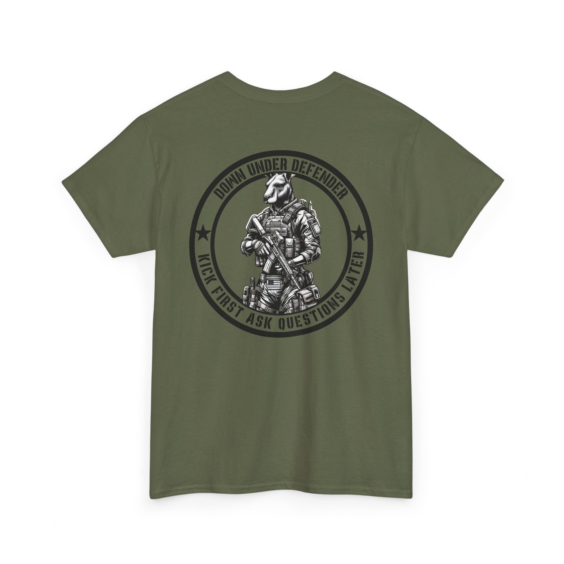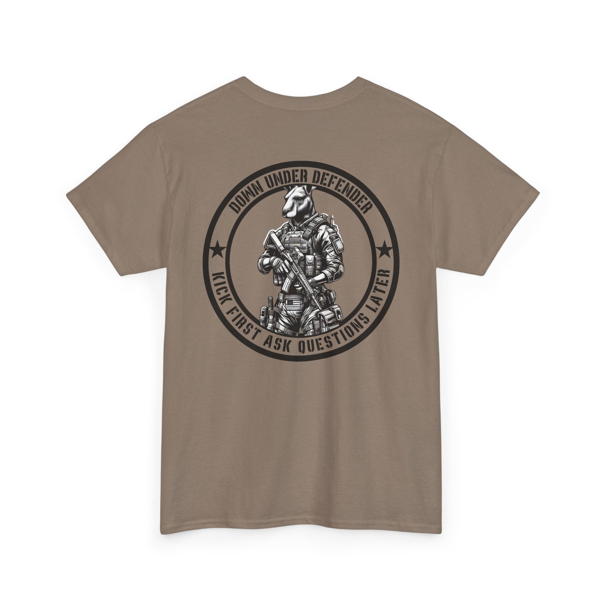 Tactical Kangaroo Shirt | Down Under Defender Tee Funny Military-Inspired Patriotic Gift Kangaroo Lovers Graphic Kick First Question Later