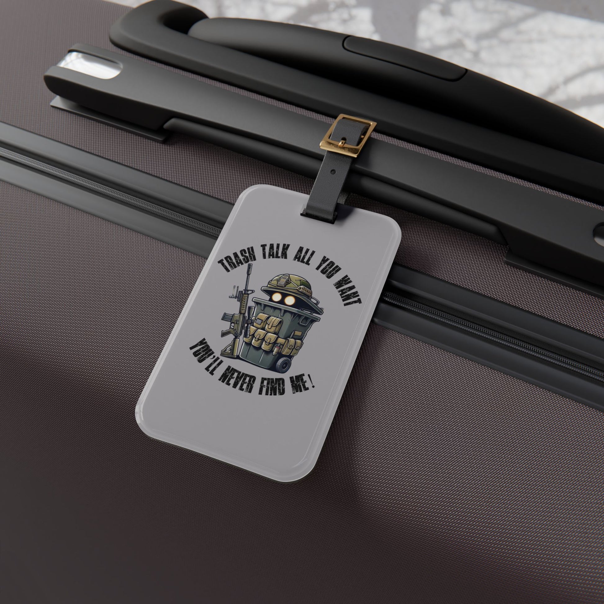 Tactical Trash Can Soldier Luggage Tag | Funny Military Garbage Bin Baggage ID | Unique Cartoon Prop Hunt Design Armed Trash Bin Gamer Humor
