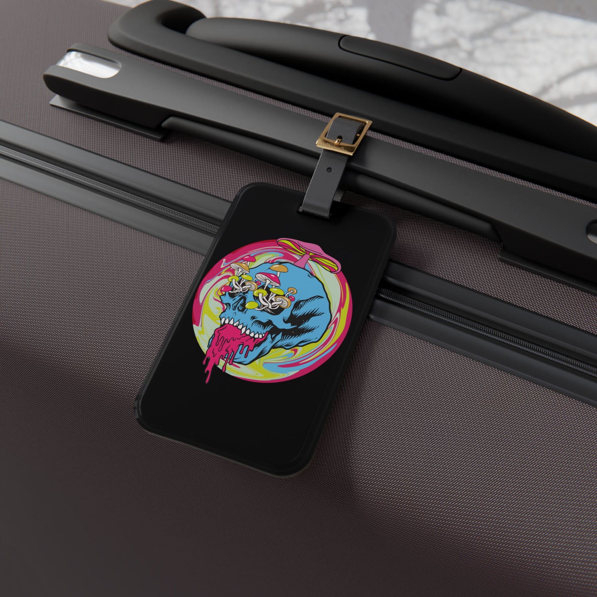 Trippy Skull Mushroom Luggage Tag | Psychedelic Streetwear Baggage ID | Vibrant Shroom Art Travel Accessory Festival Rave Lovers Urban Style