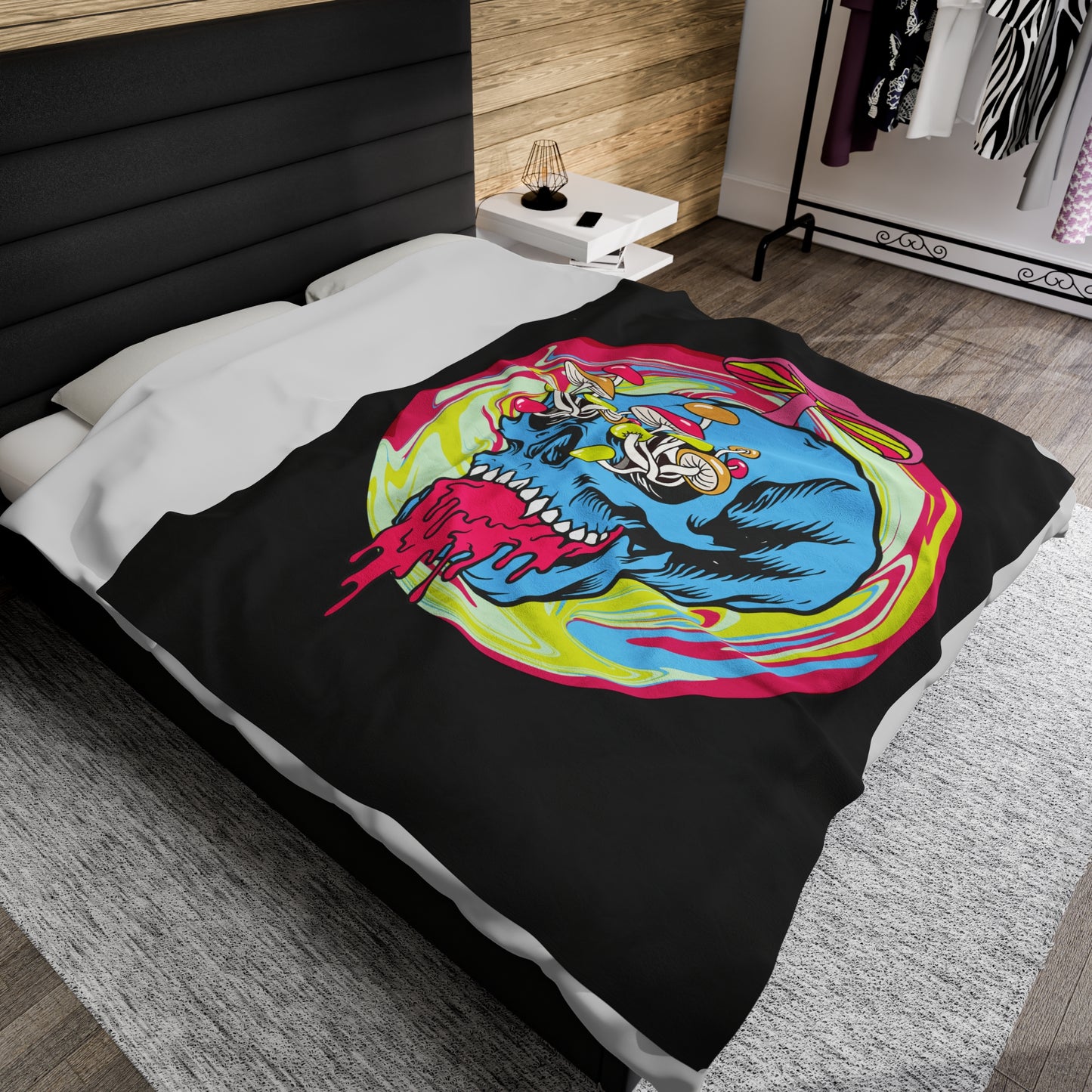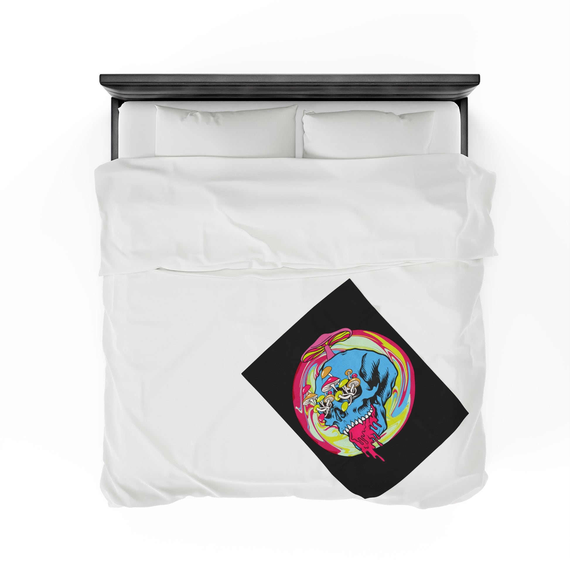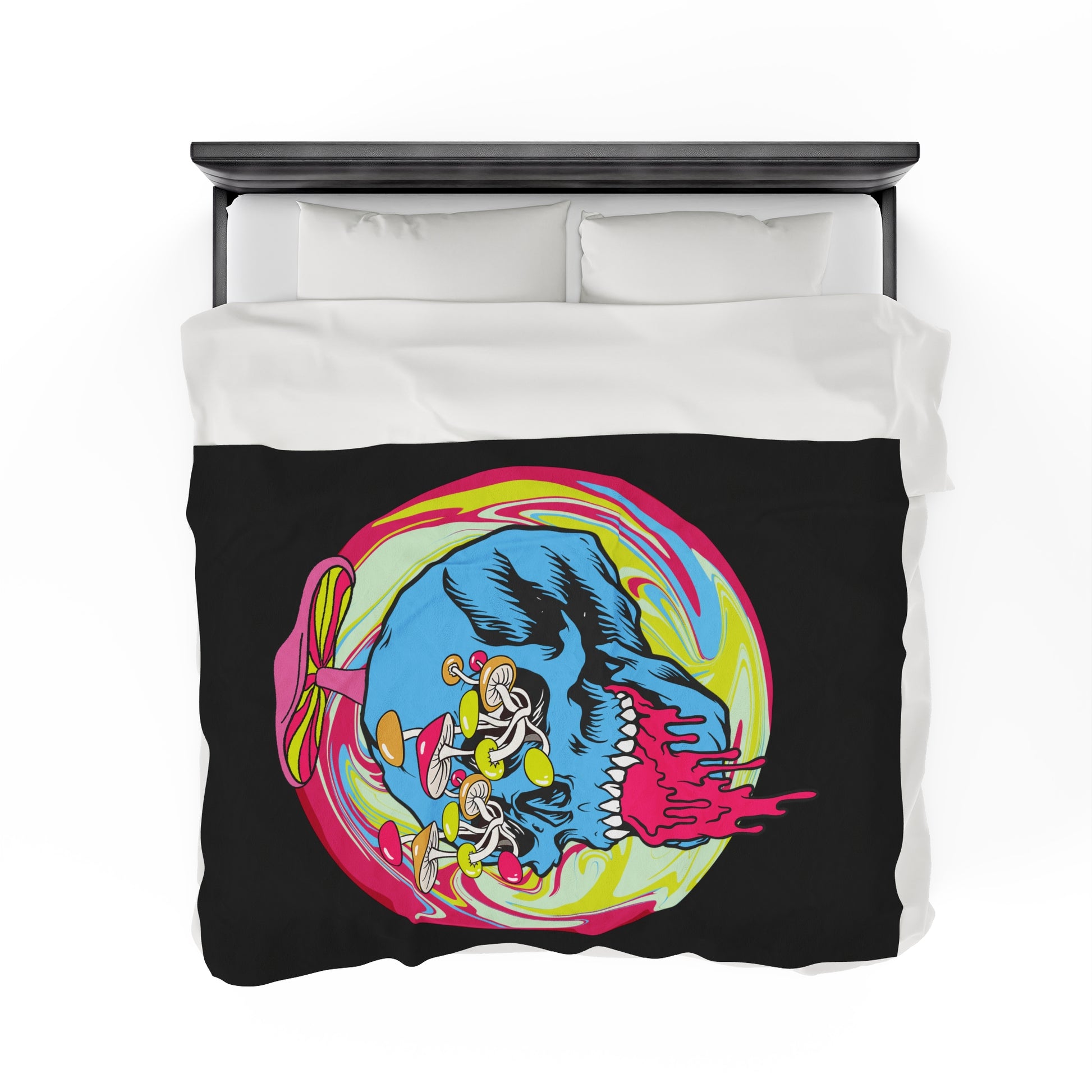 Trippy Skull Mushroom Velveteen Plush Throw Blanket | Psychedelic Vibrant Shroom Art Melting Skull Blanket Festival Rave Lovers Unique Gift