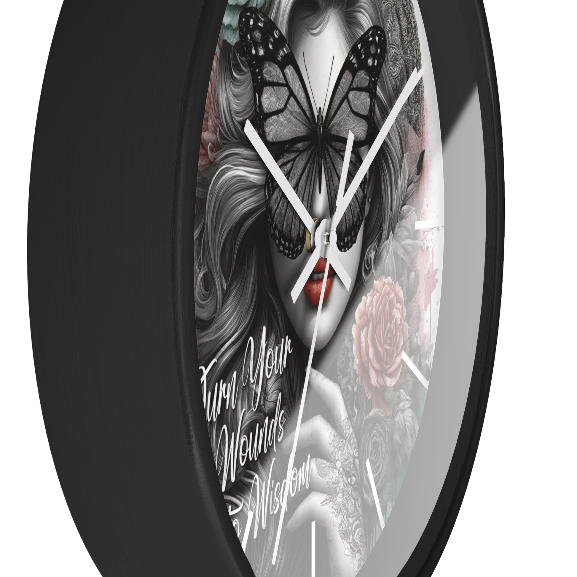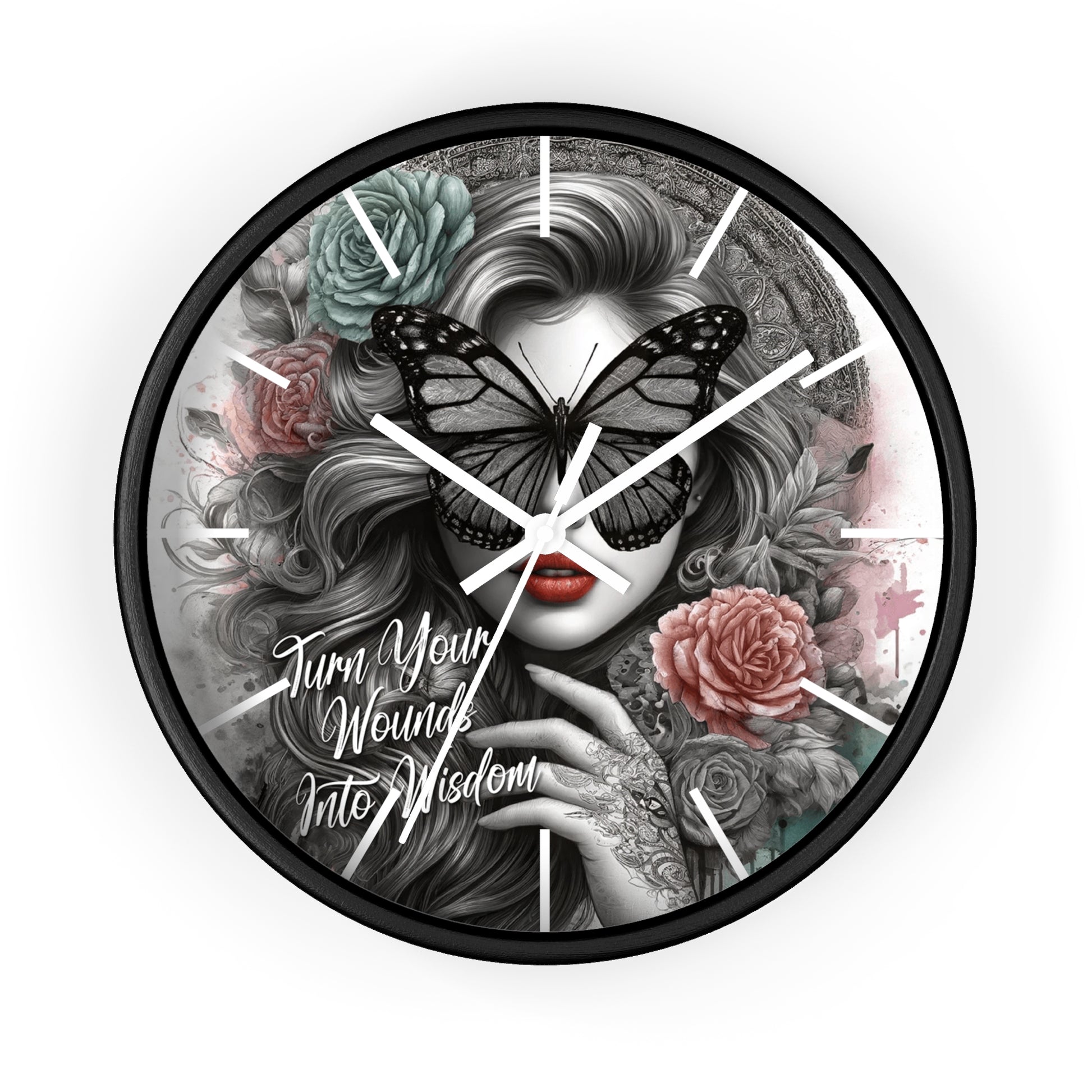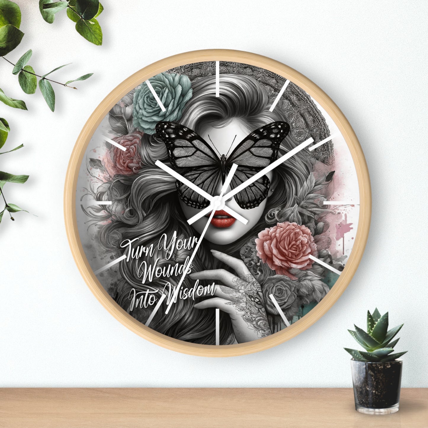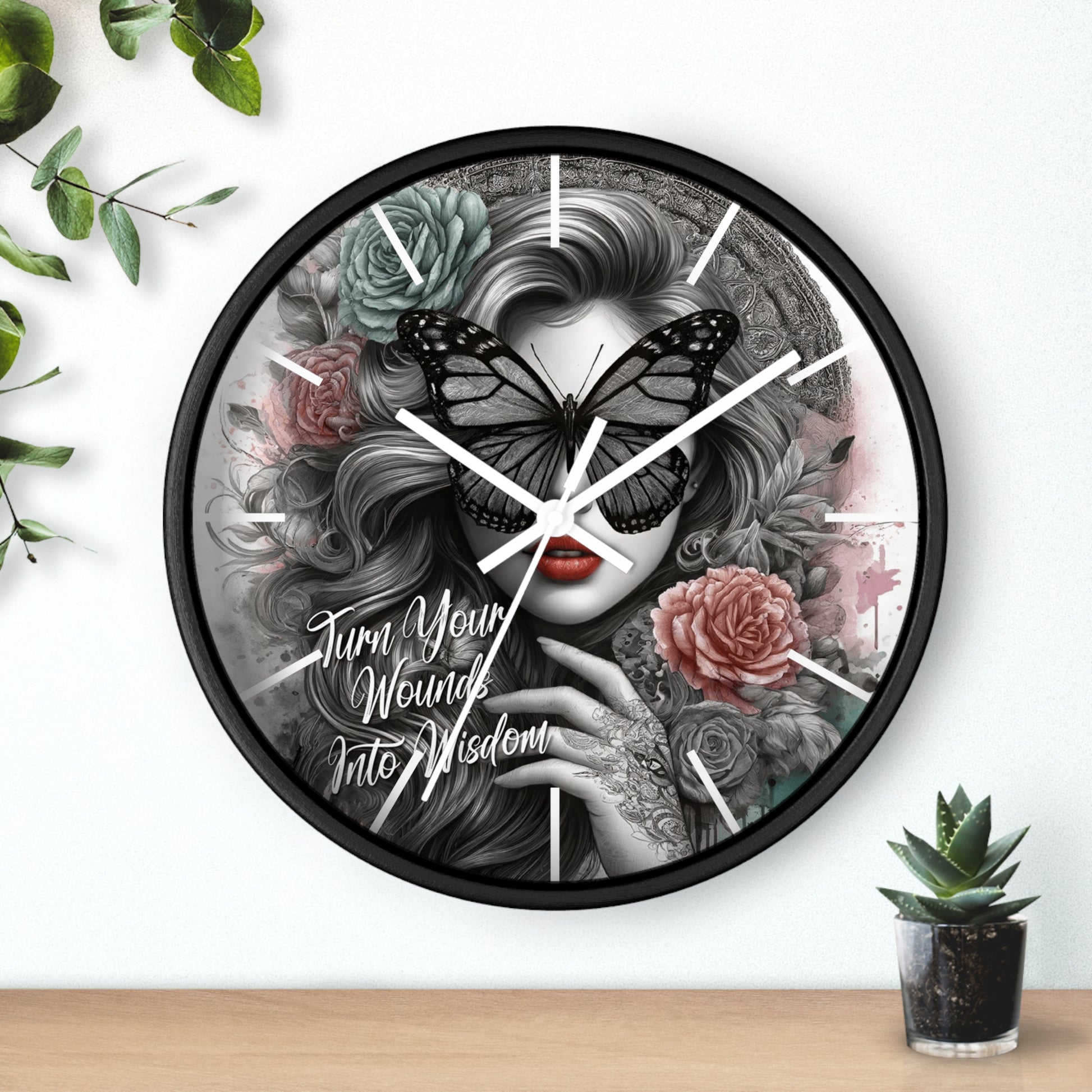 Turn Your Wounds to Wisdom Wall Clock | Inspirational Affirmation Art | Battery Operated | Elegant Woman with Flowers Dark Aesthetic Decor