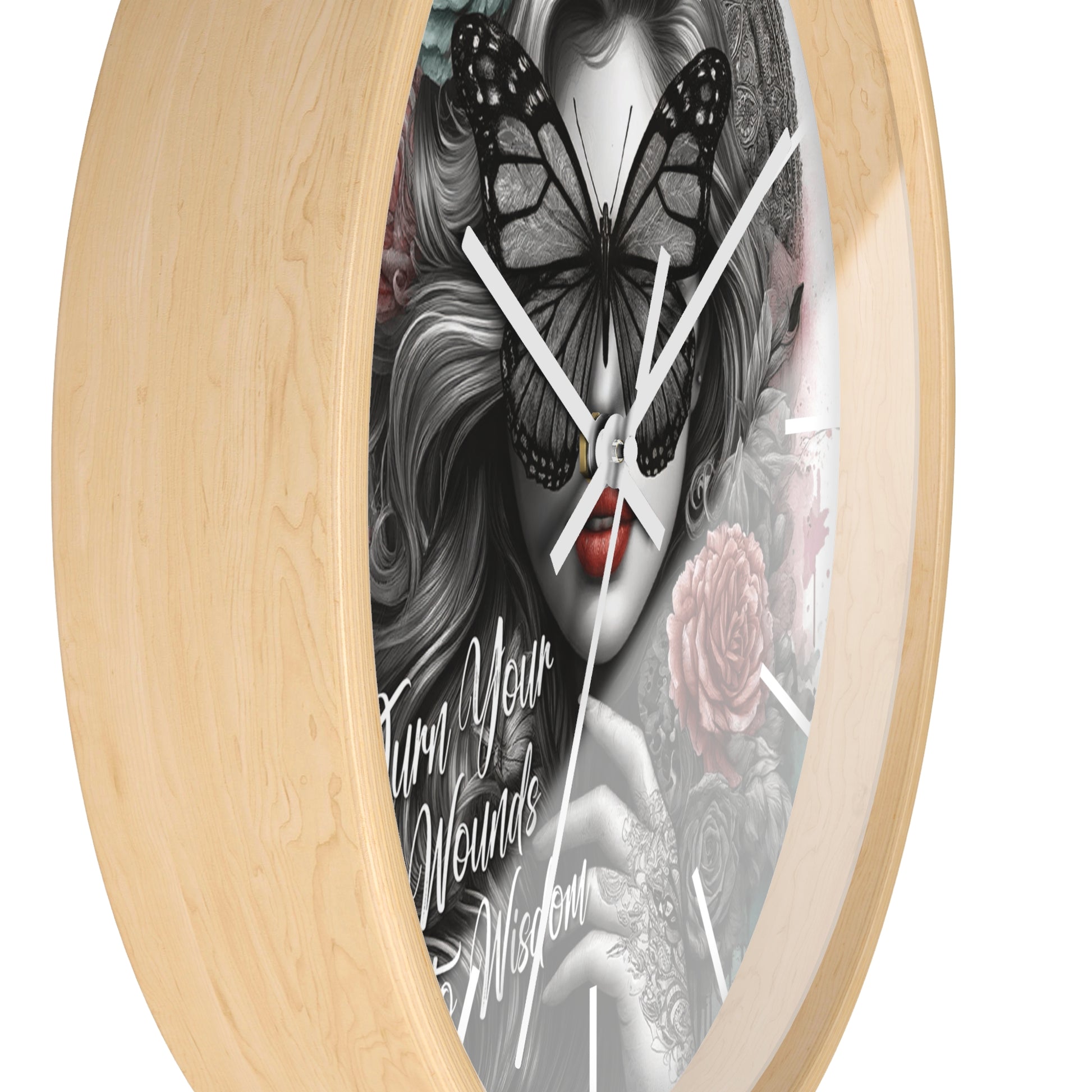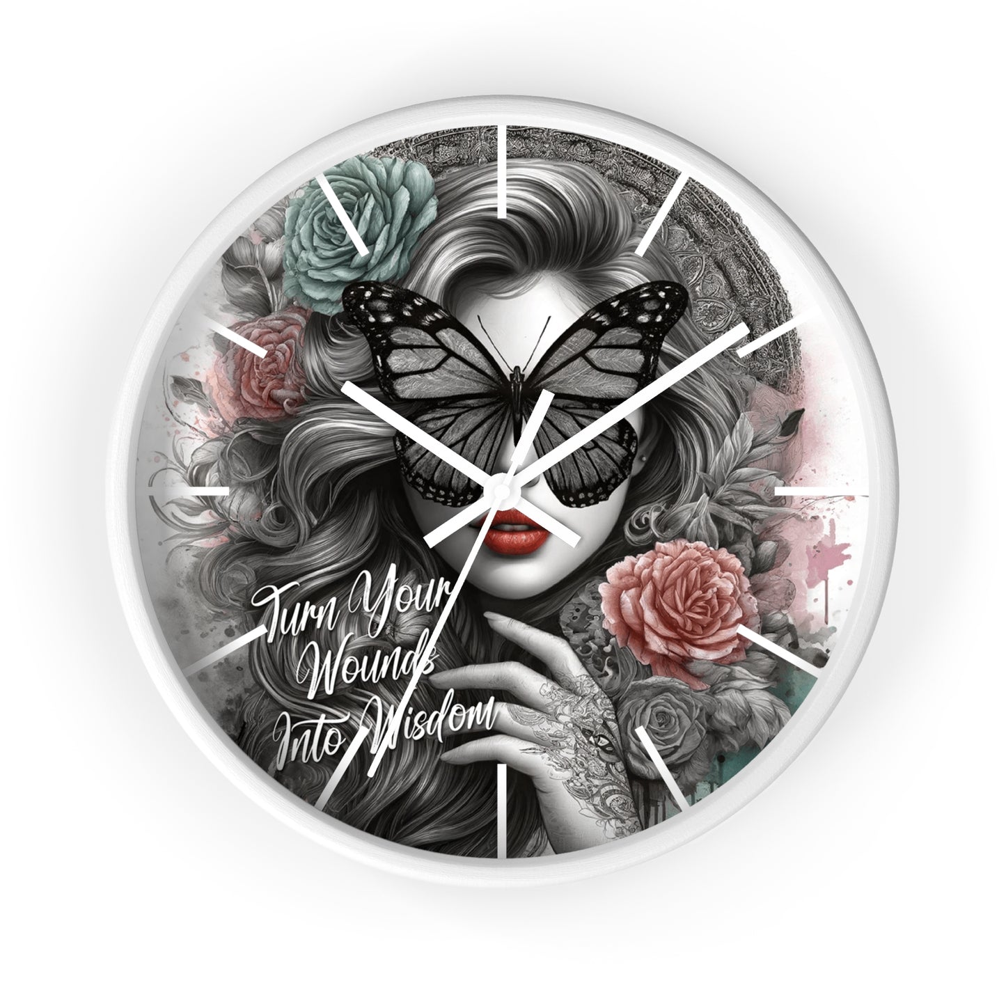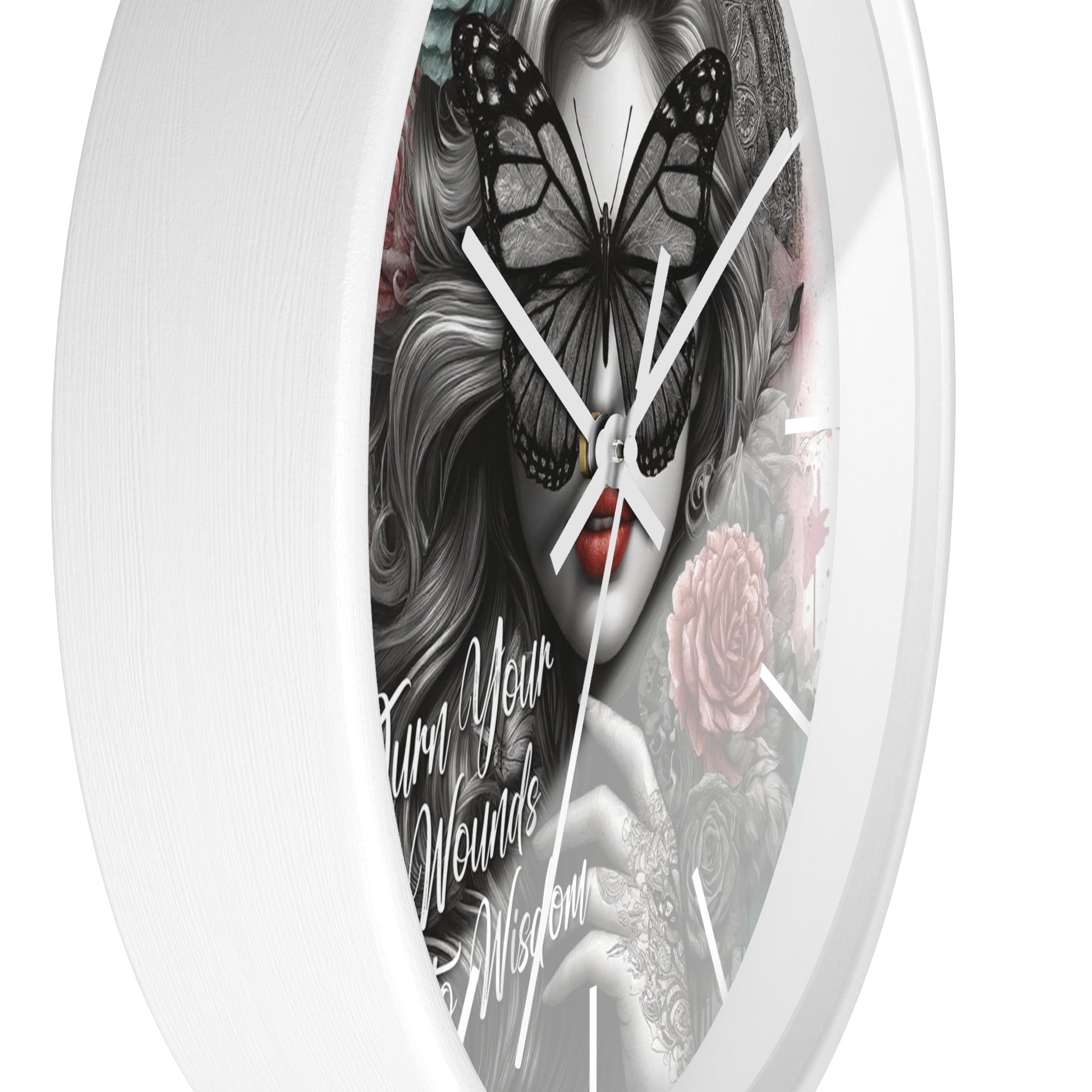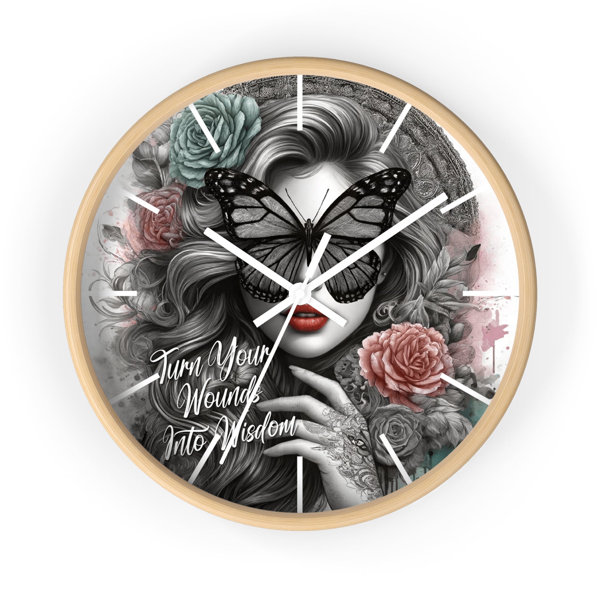 Turn Your Wounds to Wisdom Wall Clock | Inspirational Affirmation Art | Battery Operated | Elegant Woman with Flowers Dark Aesthetic Decor
